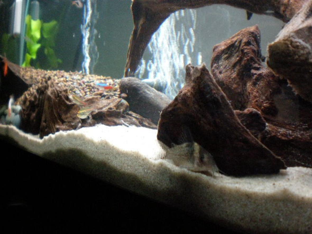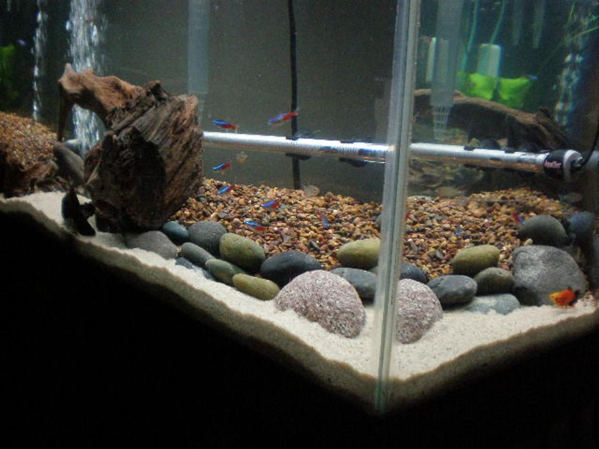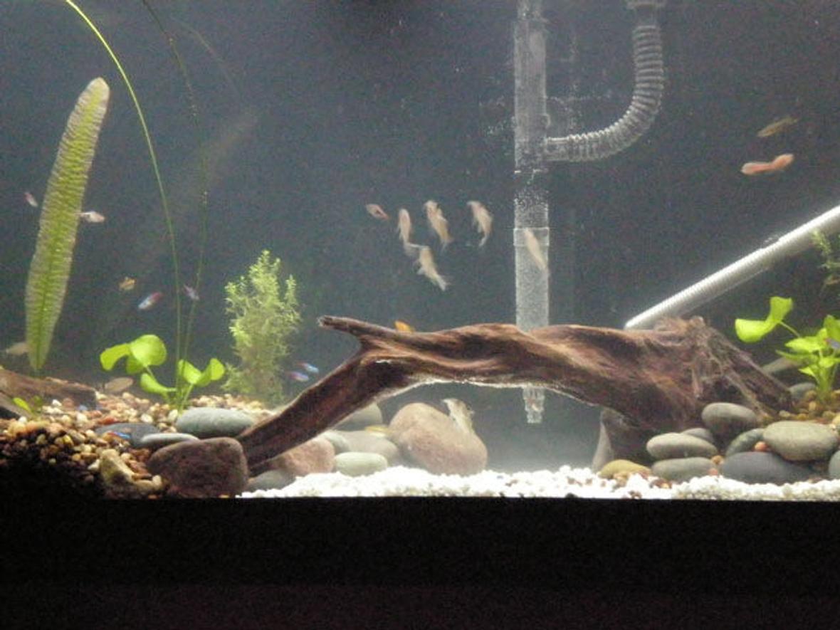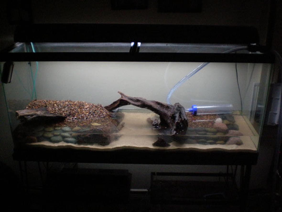55 gal long seascaped freshwatertank. consist of 1-48" 40 watt light; 1-aquaclear 110, 1-aquaclear 30 power filter (for now)...1-300 watt aquaclear heater,1-whisper 60 bubbler,in-tank thermometer,seachem in-tank ammonia alert.no backround as of yet.
