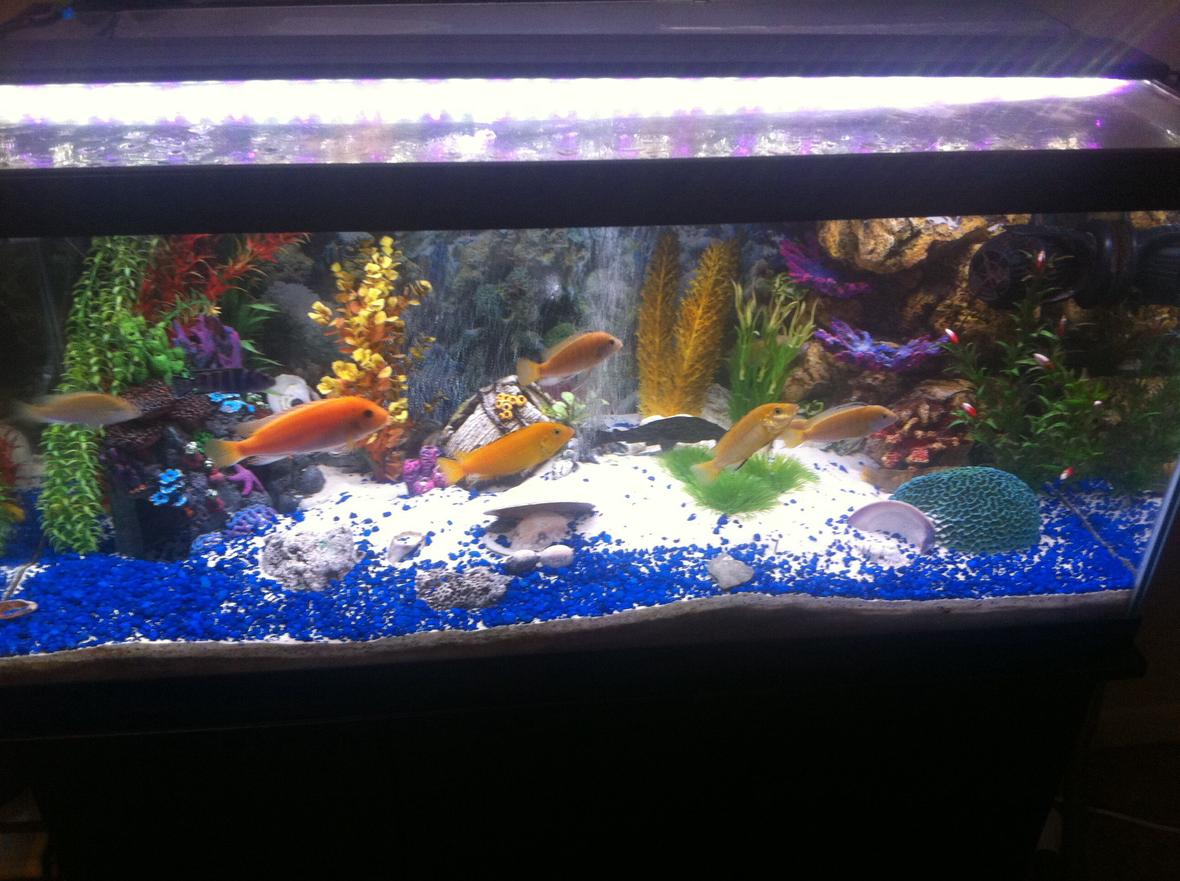 My tank is a 40 gallon breeder tank, argonite sand for substrate. Coral skeleton pieces to keep the ph at a steady 8.0 for my Mbuma cichlids. I'm using a marineland 55 gallon canister filter, current usa salletite led light strip. I'm also using a 80 gallon air pump, & I had real plants in the tank, but the cichlids & algae eaters enjoy eating them. I treat the water by the gallon, using prime to condition the water, also using API fresh water aquarium salt about the size of a quarter in my hand & about 5 drops of Prime per gallon. I keep the temp around 78 to 80 degrees. I use a 80 gallon circulation pump to keep currents in the tank.