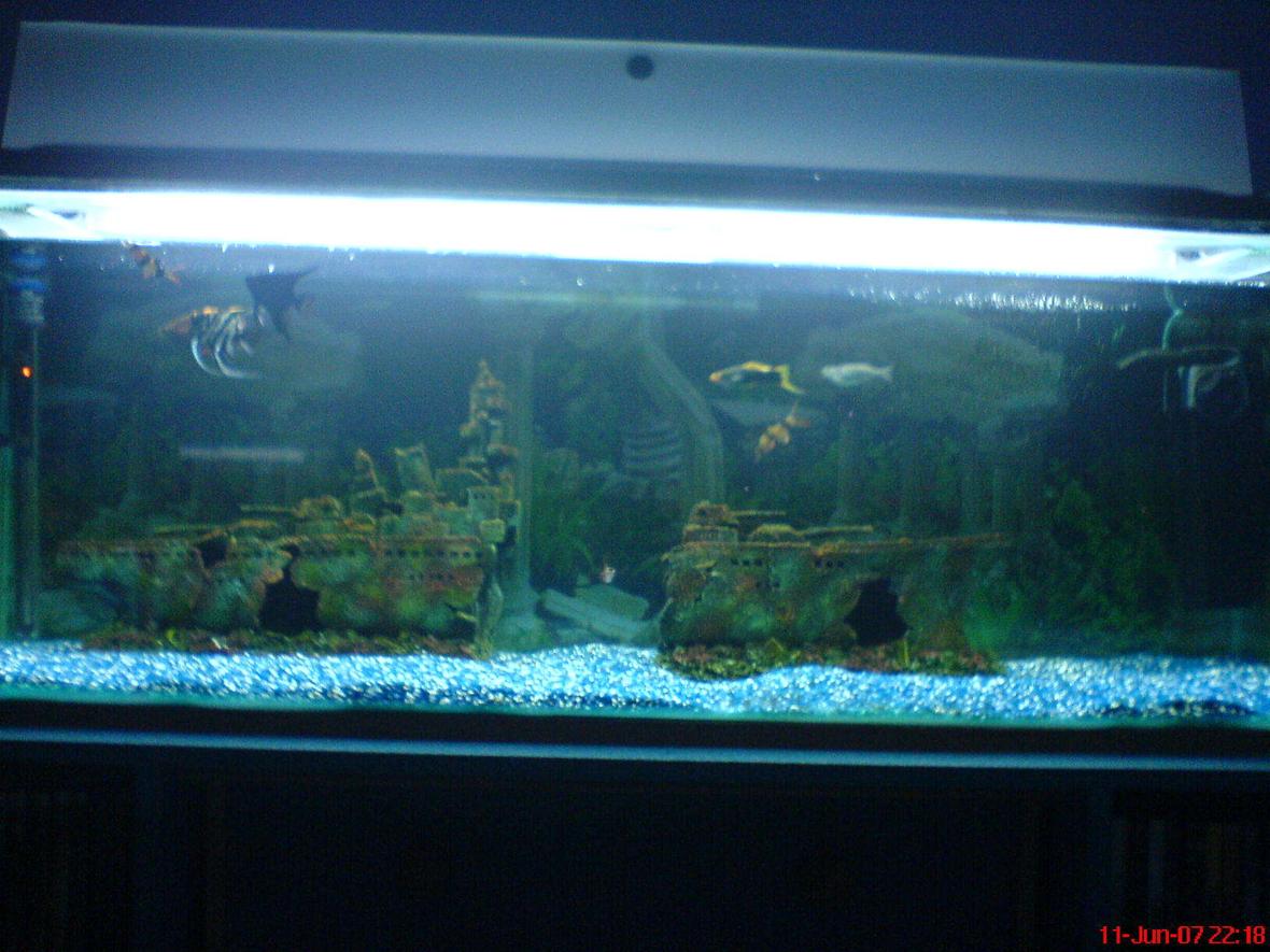 4" tank ~ 2xSword tails, 5x Angel fish, 2x clown loaches, 1x brislnose fish, 2x like shark fish and more but i dont know the names to them.
