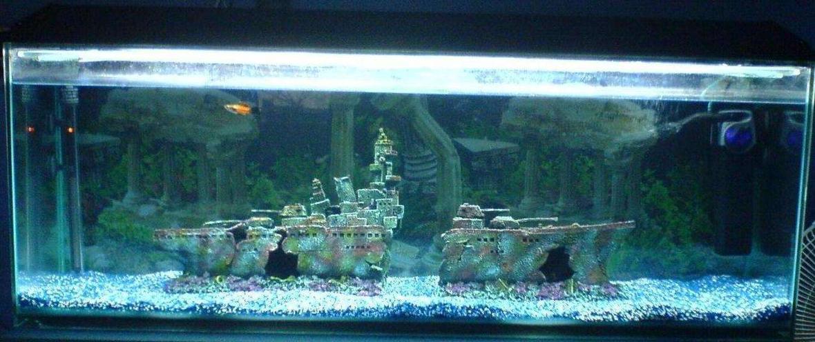 It is a 4" tank with a 2" WWII Boat in side, there are only 3 in there at the moment but more will be in soon! i have mixed (white, blue and drak blue). As for the filler, it has a UV light inside of it that will kill germs as it bring the water though.
