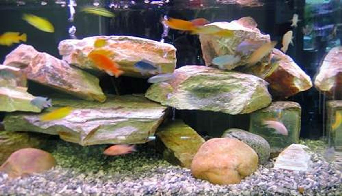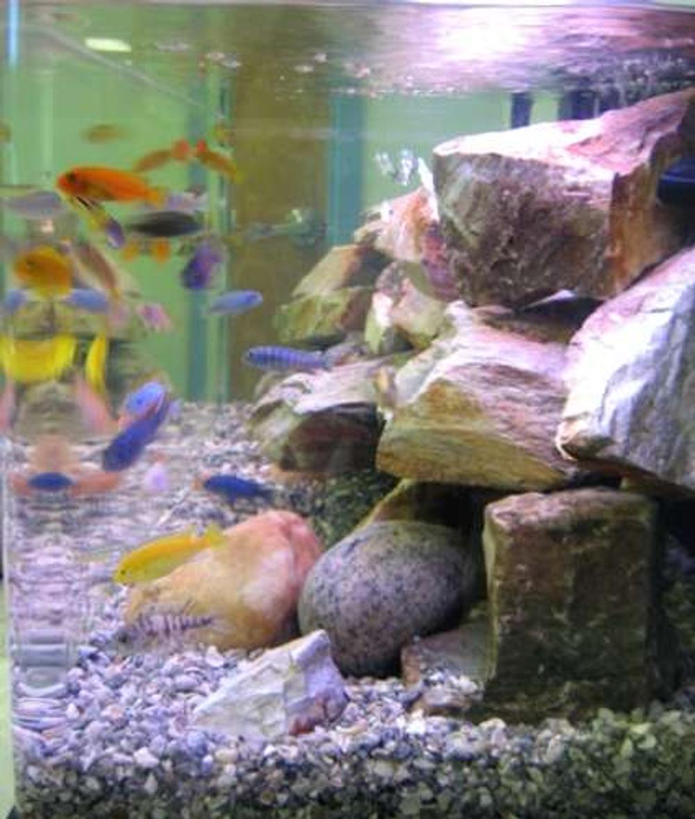 65 gallon Assorted African Cichlid Tank. Substrate = Carib Sea Cichlid Substrate. Rocks used to create a natural effect. 3 Penn Plax Cascade 1200 Canister Filters used for filtration.