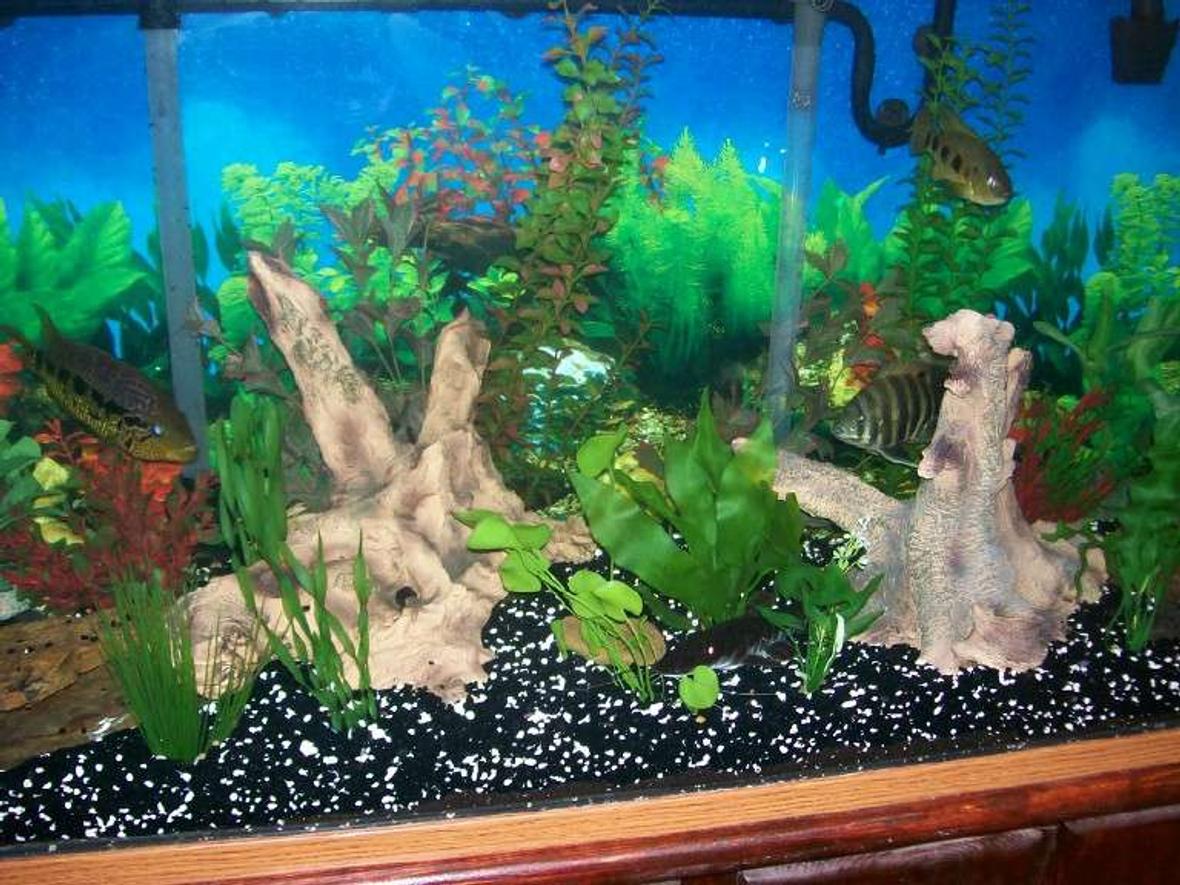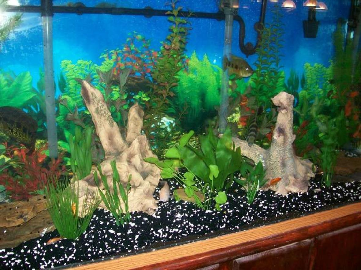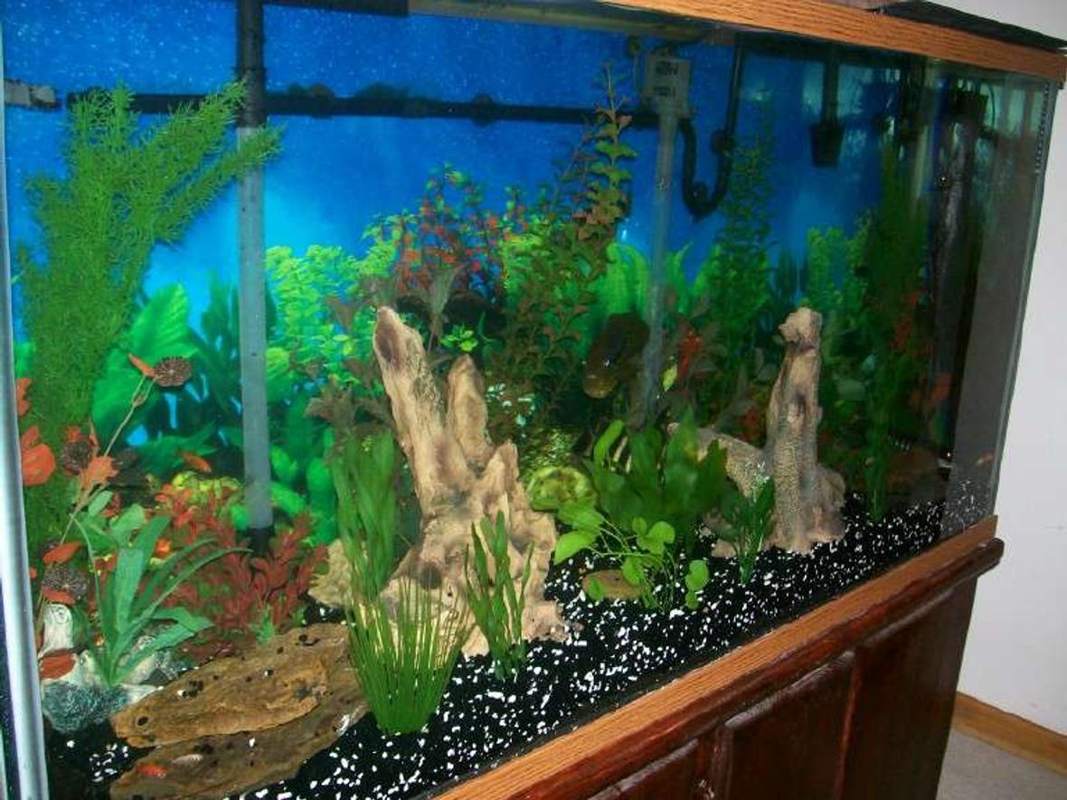140 gallon freshwater new world cichlid tank, undergravel filter powered by 3 power heads, 2 aquatech back filters, and one cascade 1500 canister filter