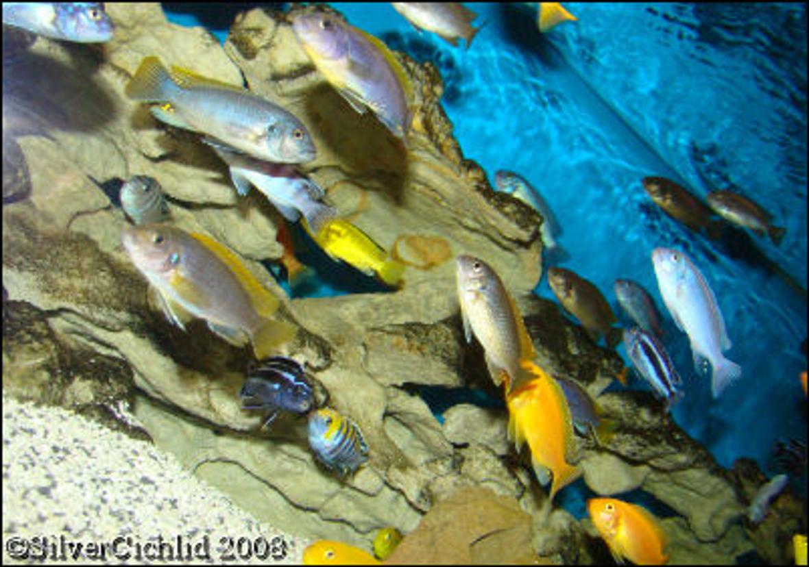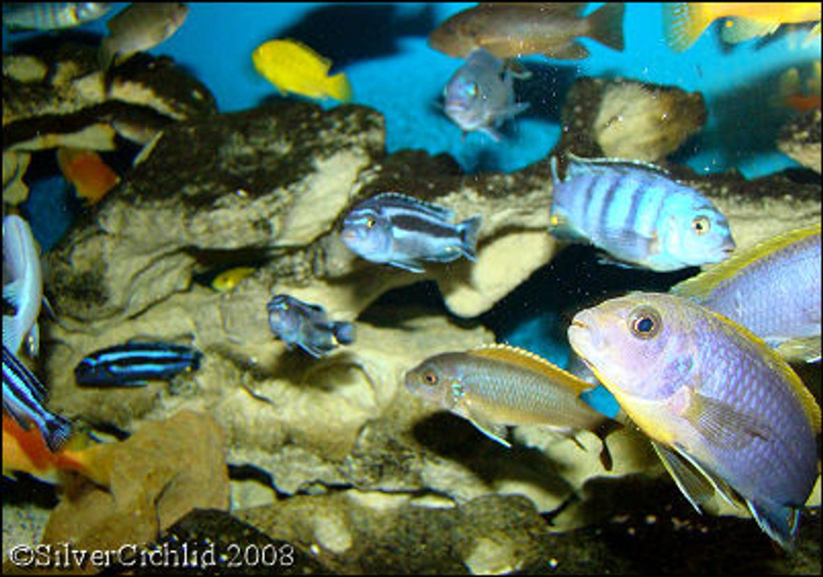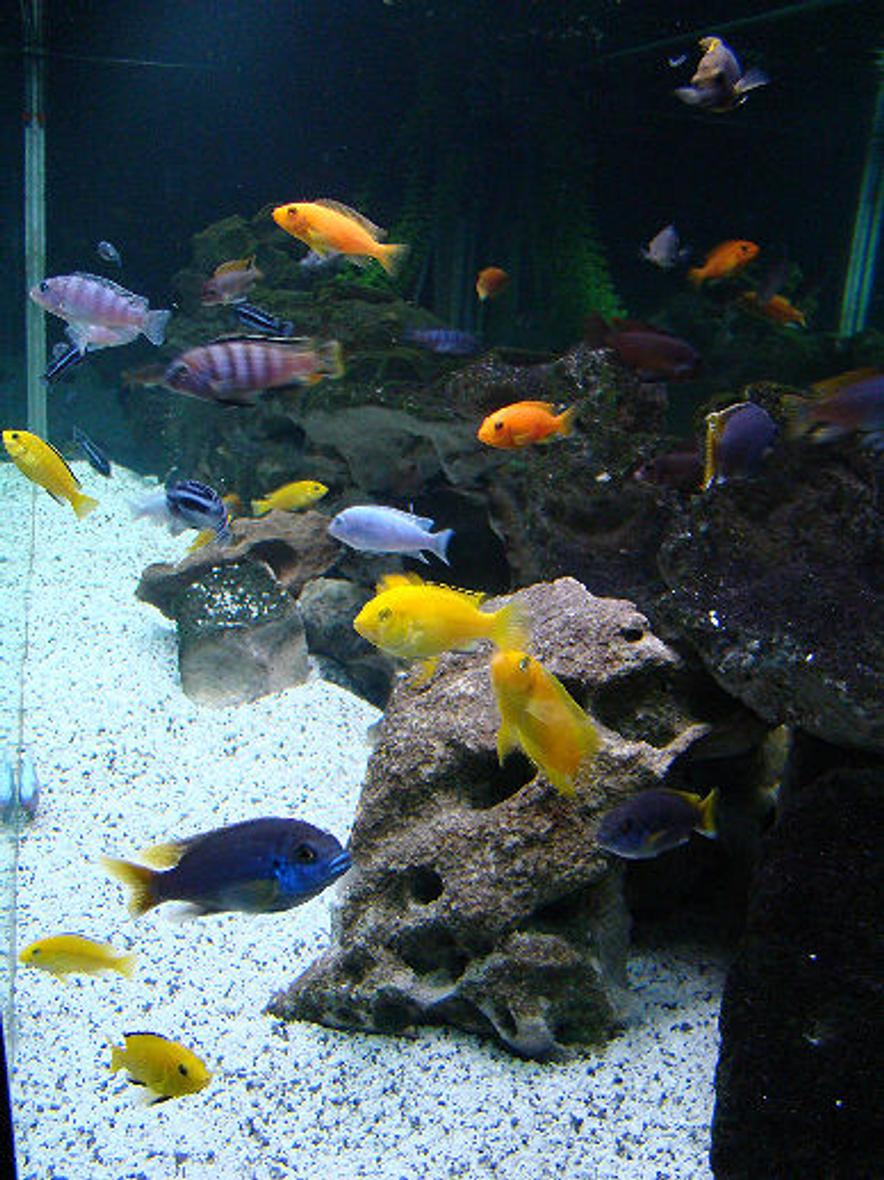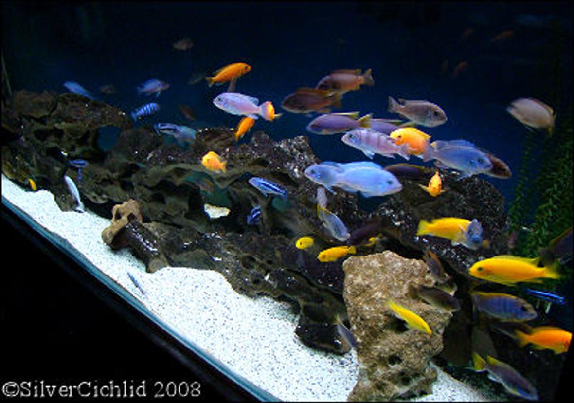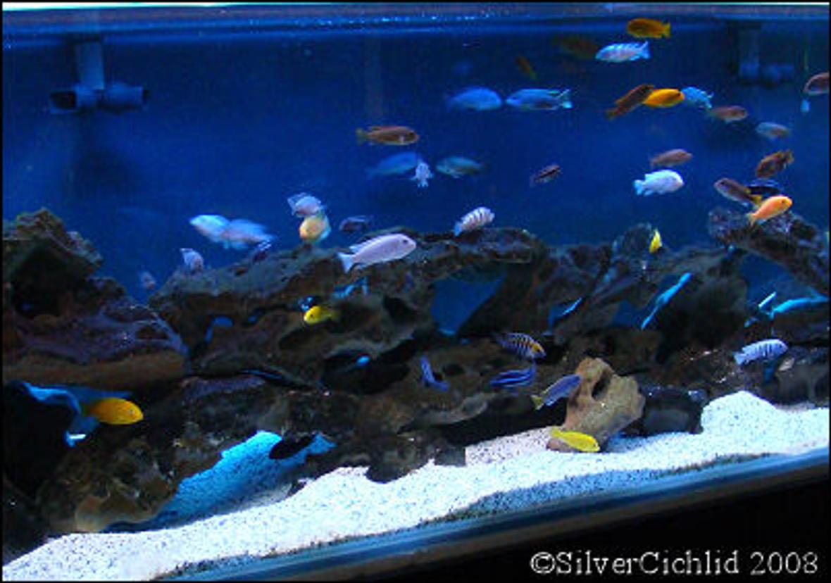 6x2x2 African Cichlid Tank. Aqua-Glo, Power-Glo & Marine-Glo. 2 x Fluval FX5 canister filters, 1500lph power head, bubble curtain at back and 2 x Jager 300w heaters. White & grey aragonite sand and ocean rock. Water changed 20-30% weekly, filter cleaned/changed once every 2 weeks.