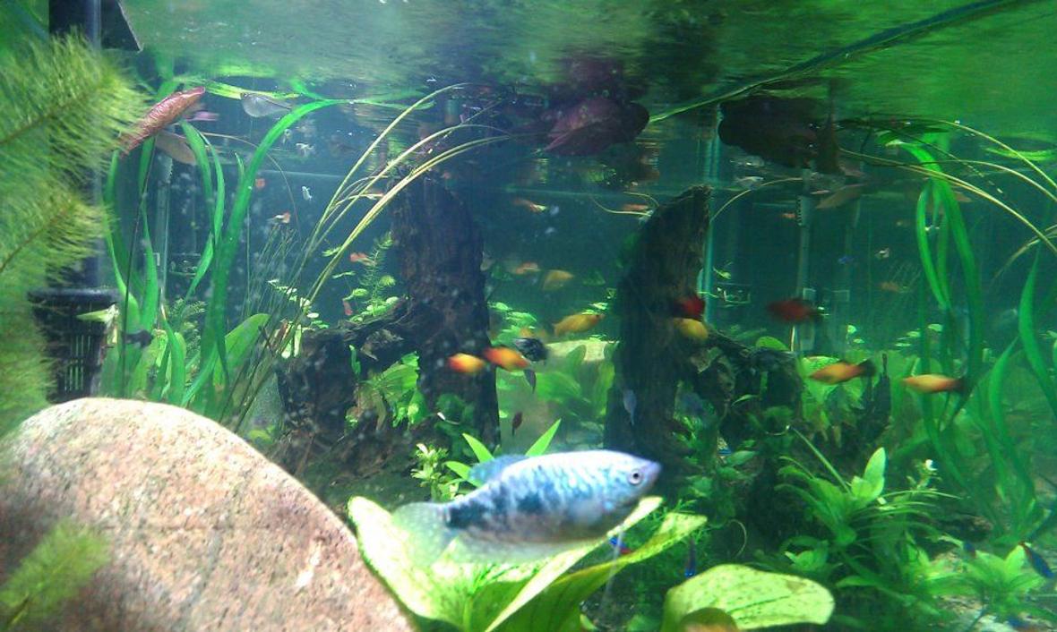 Mollies,Platys, Corys, Golden alge eater, Rubber lip plecosumus, African black knife,Clown loach, tons of ghost shrimp, 4 snails, african dwarf frogs, 4 Angel fish, neon tetras, other tetras, rainbow fish....uh i think thats it. All together about 60 fish not including the 50 ghost shrimp.( they dont last long, my Angelfish eats them, its a great treat for them though)