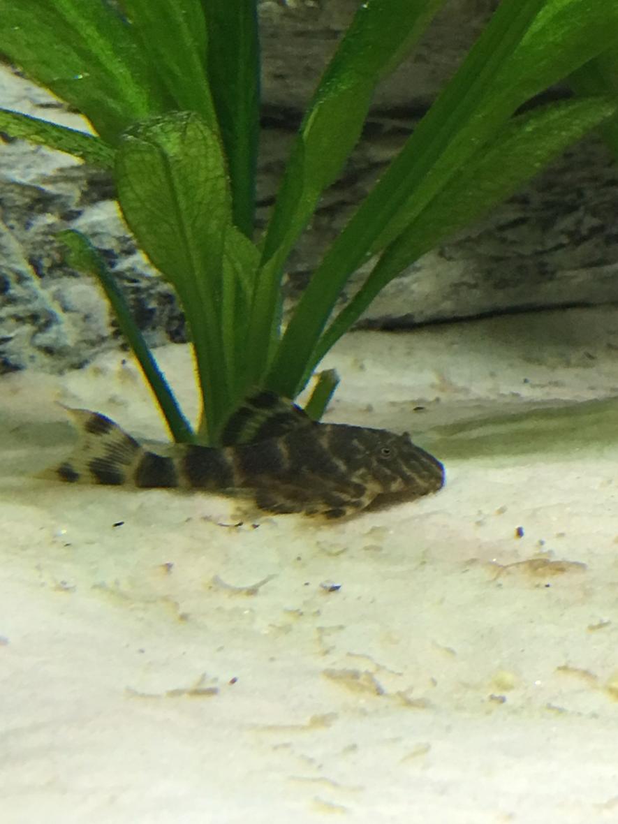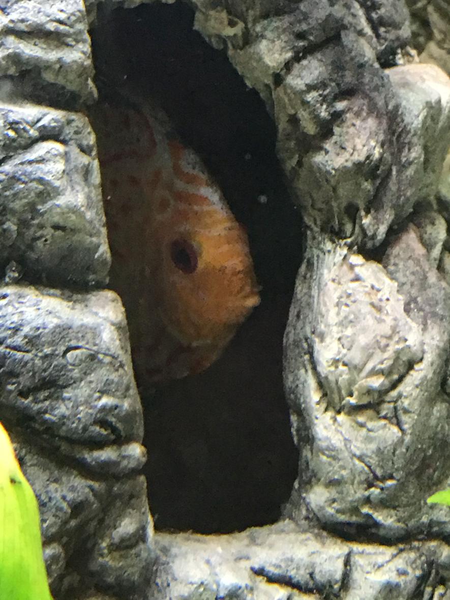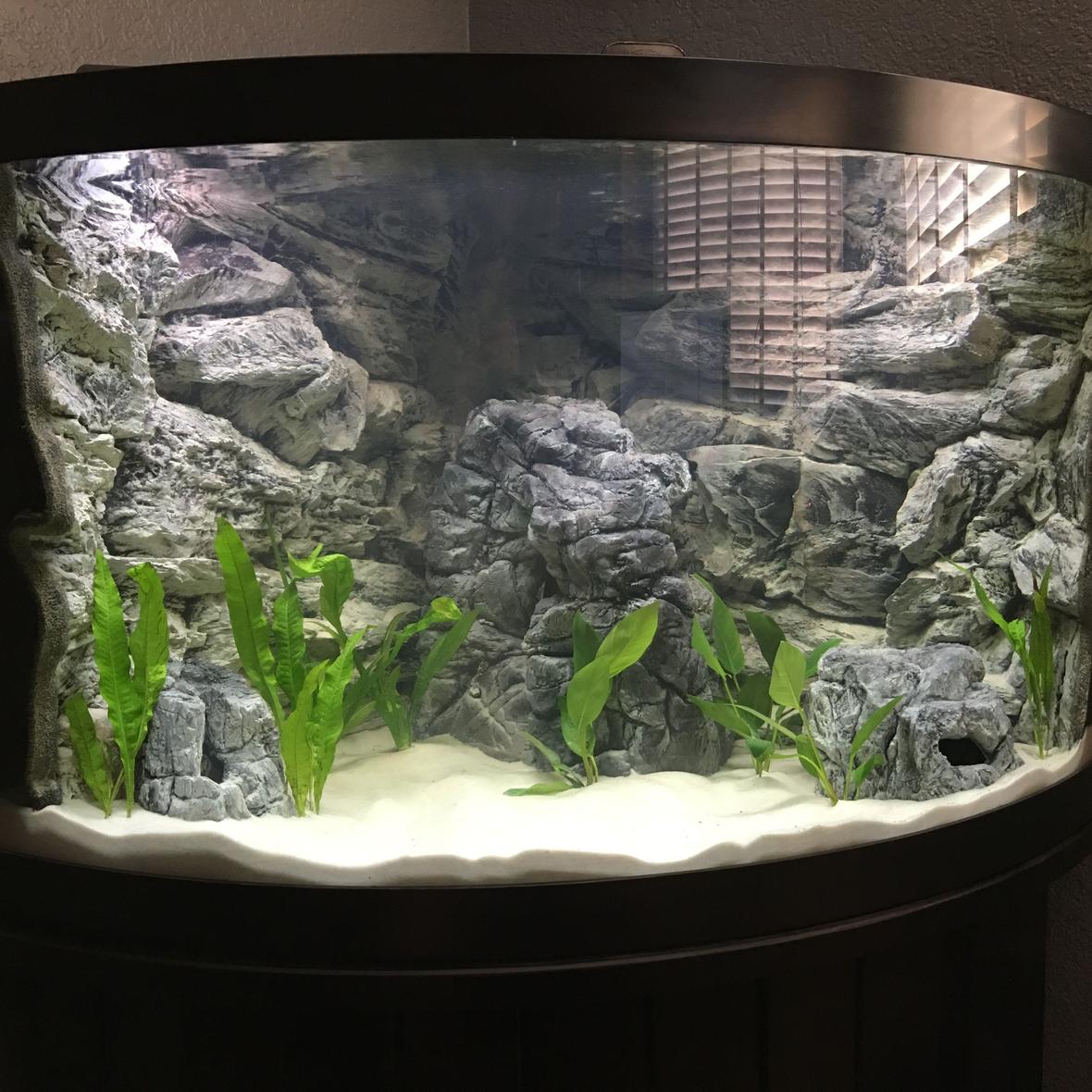 55 gallon with 3D custom rock background with live Amazon swords and other plants. Discus Fish (4) + 1 pleco.