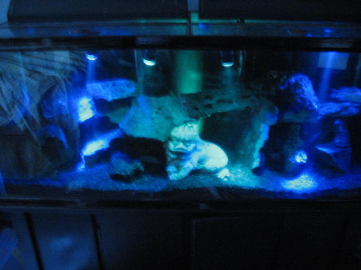 4 foot long 75 gallon, mixed african cichlids from lake malowi, 5 led green and blue spotlights(sick with lights off)
