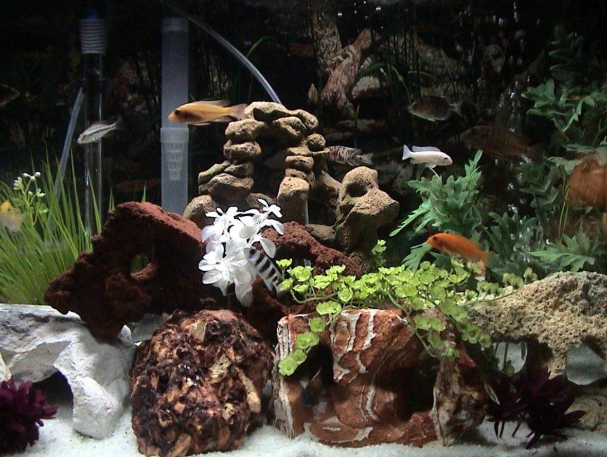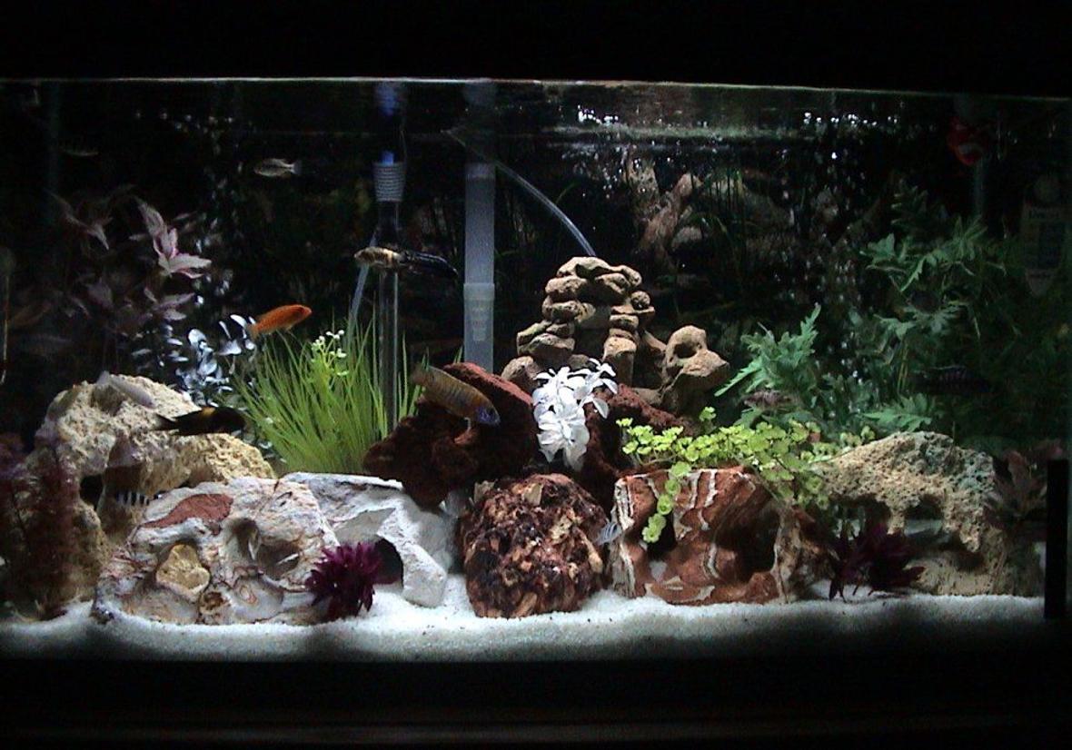 40 Gallon All Glass Aquarium tank. AquaClear 110 filter, 150W submersible heater. I make my own bone charcoal bag for filter. Two pounds of charcoal in a 110 AquaClear filter. Charcoal is rinsed once a month and changed every two months. Lighting is a standard All Glass florescent light and I have Miraclebeam Hi-Lites blue/green for a moonlight effect. PH is 8.