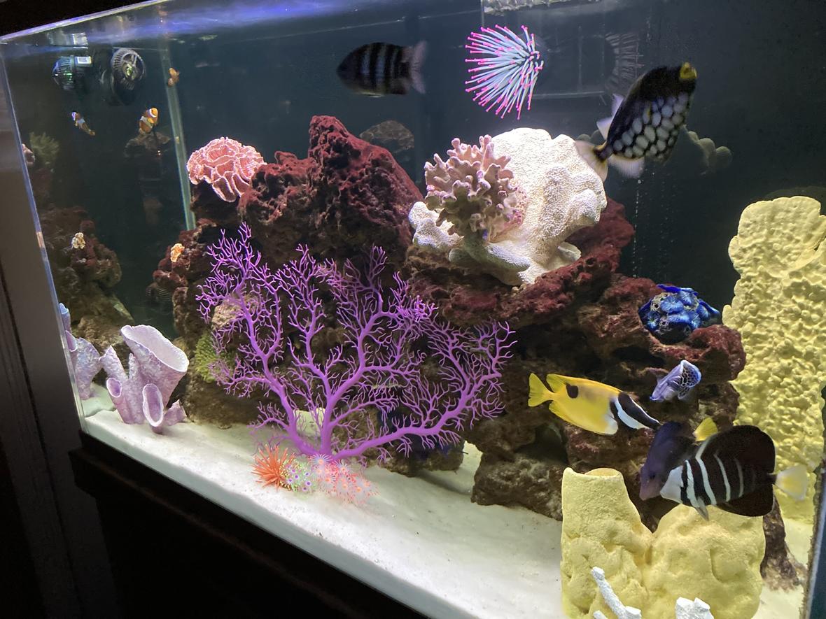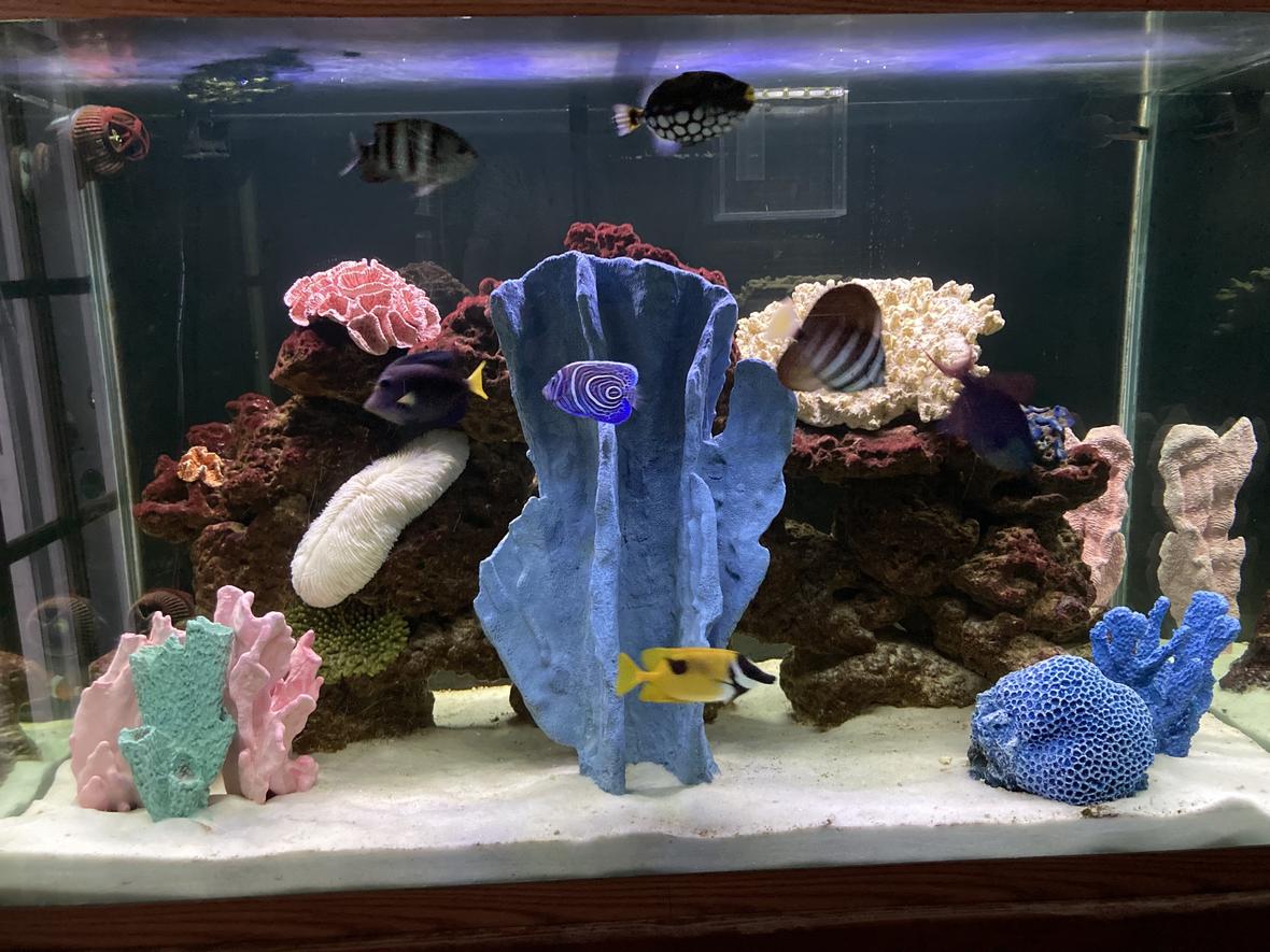 150 gallon Saltwater Tank purchased 2006. 48"L x 30" H x 24" W. 200lbs. Live Rock. Inhabitants: Clown Trigger. Niger Trigger, Fox Face Rabbit, Cinnamon Clowns, Pecula Clowns, Lemon Clown, Purple Tang, Sailfin Tang, Fire Shrimp.