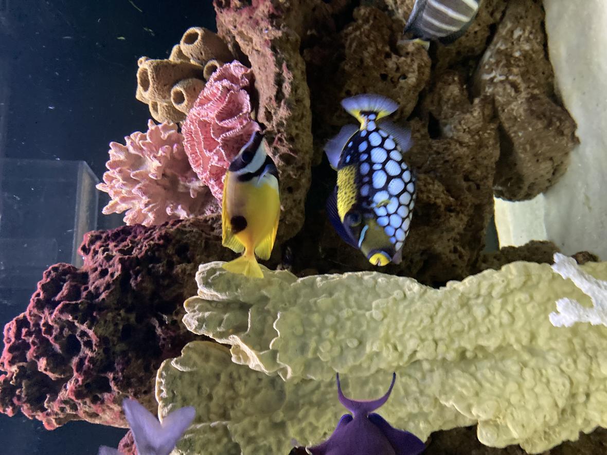 Clown Trigger, Clown Trigger. Niger Trigger, Fox Face Rabbit, Cinnamon Clowns, Pecula Clowns, Lemon Clown, Purple Tang, Sailfin Tang, Fire Shrimp.