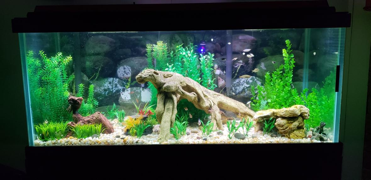 Here's my 90 gallon aquarium. It's 48 1/218 1/2 25 3/8 show tank. It has a Fluval remote controlled led lighting system. I have two Marineland Emperor 400 hob filters. I have two Fluval 300 watt heaters. Its has plastic plants and two live plants. I also have two airstone plants with a Fluval dual channel air pump.