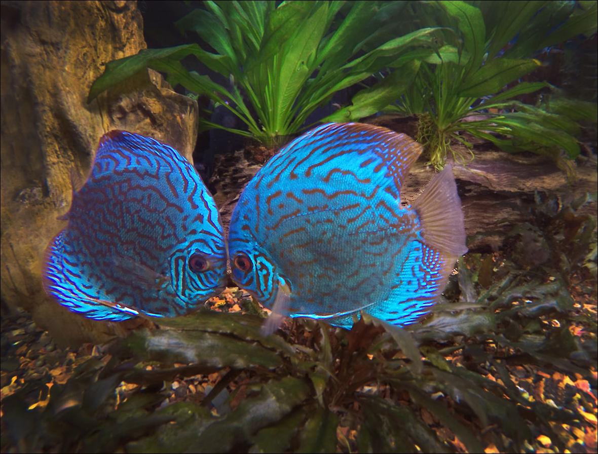 Discus, Angel fish Cardinal Tetras, Clown Loaches, Gold Spotted Plecostomus and Albino Coryadoras.
