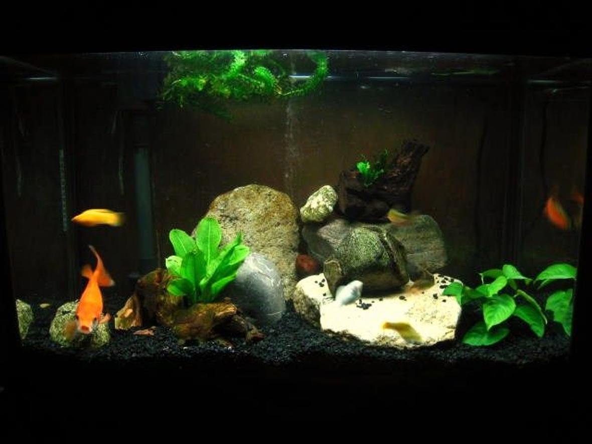 In the 29 gallon: comet goldfish (1), mollies (3), rosy barbs (3), adonis pleco (1).