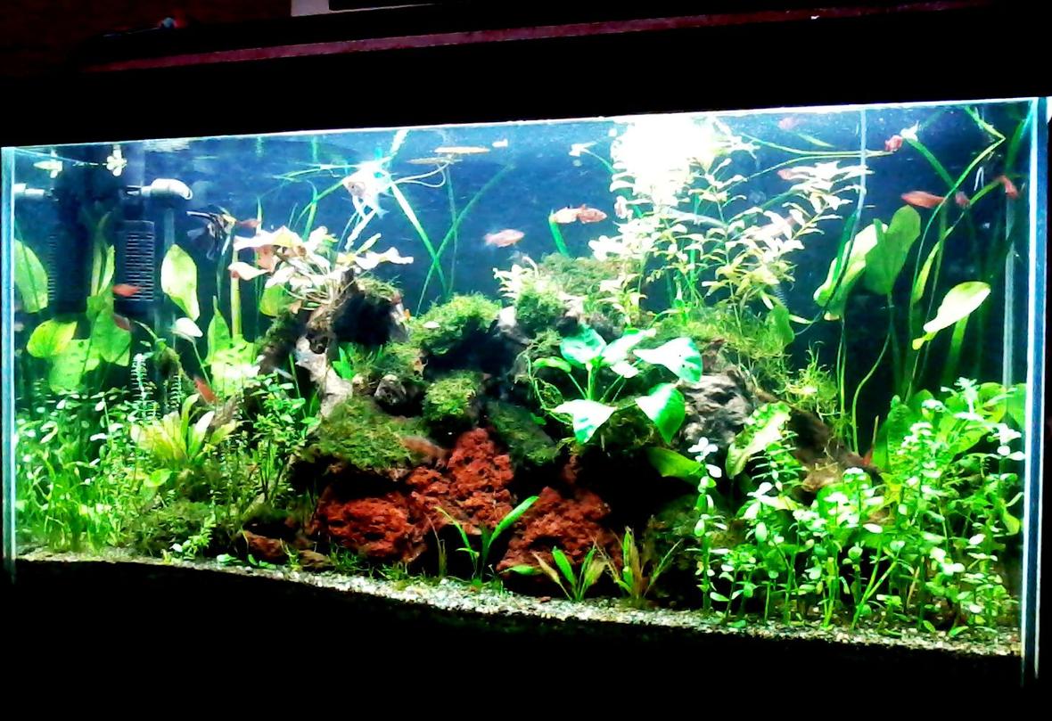 90 gallons planted tank (mostly live plants and fish) - 48 x 24 x 18 inches (low tech/ natural method) Latest image taken with java ferns. DIY lighting system with 1 x 28 watt blue lamp (subdued light) and 4 x 28 watt T5 tube all on timer. DIY overhead filter with enclosed pre-filter inside a very large plant box. DIY CO2 (yeast) directly injected at the moment with powerhead. Top Substrate is sieved construction gravel (2-3 mm) while underneath is a combination of dirt and potting soil. 8 gallon up to 50% weekly water change depending on my mood. DIY excel daily while DIY fertilizer formula and DIY trace element on schedule basis. The application regimen is carried-out by daughter and wife (only home at weekends). Air pump on at 6pm and off at 6am.