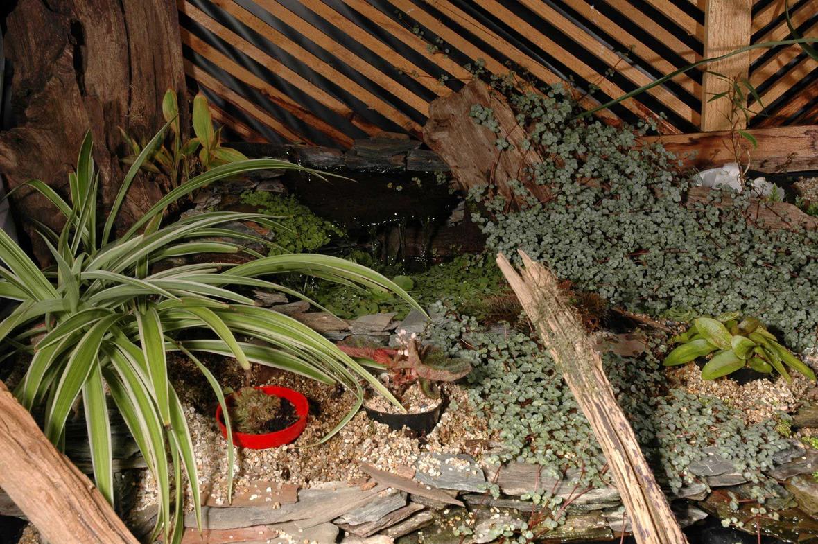 240g 72x30x24 from GlassCages with Euro-bracing, drilled for filtration. Dual 400watt metal-halide 10k lights suspended 24" above the tank to light the 24" deep bog behind the tank. Water is pumped up into the bog and allowed to flow back into the tank. Mechanical filtration is Ocean Clear 380 (with UV) plus an inline heater module driven by a Quiet1One 4000 pump. There is also a homemade fluidized bed filter and CO2 reactor driven by a ReeFlo Snapper 2400GPH pump. Neptune AquaController Jr. Compressed CO2 system. Automatic top-off system. Plumbed for semi-automatic water change with pre-heated RO water from storage tank. Fertilized with PMDD.
