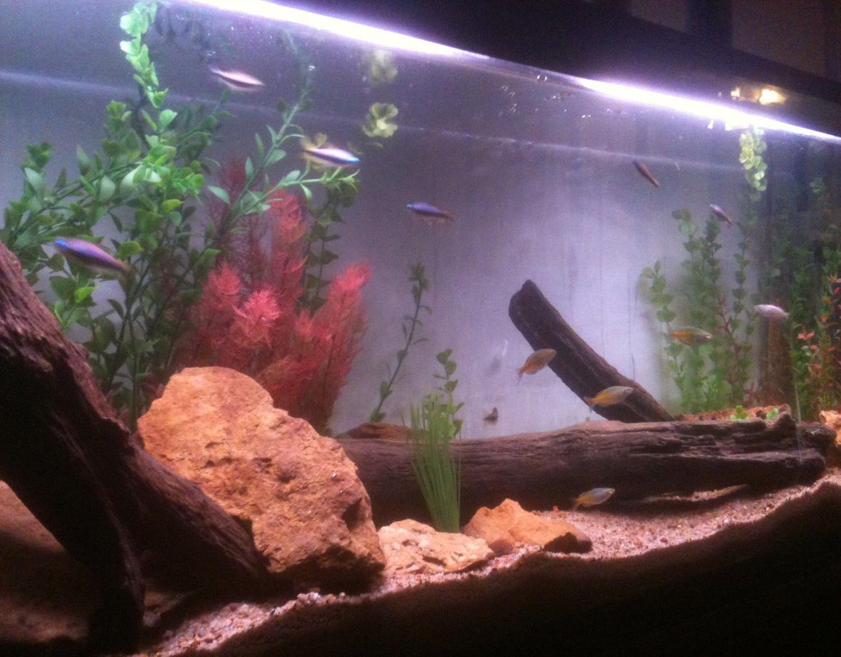 I work for water treatment company so they gave me a digital controler and stand alone heating controler. I'm using the main controler to monitor temp and to control when the heat comes on/off. also using the controler to run light cycle. could use it to also do ph monitoring but havent. First go around with a painted background. it turned out ok, could be a lot better. but I do like the white look instead of usual black or blue. 5 Boesmani Rainbows, 7 Emperor Tetras