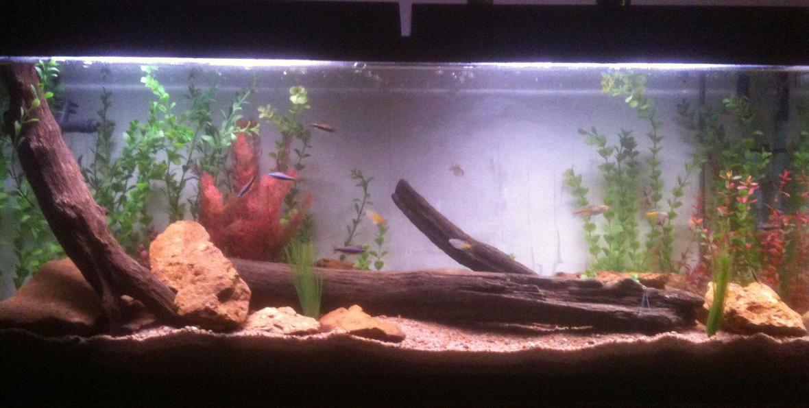 48" Long 55 gal. tank. Cheap T8 lighting, upgrade to led eventually. Bubble wand.