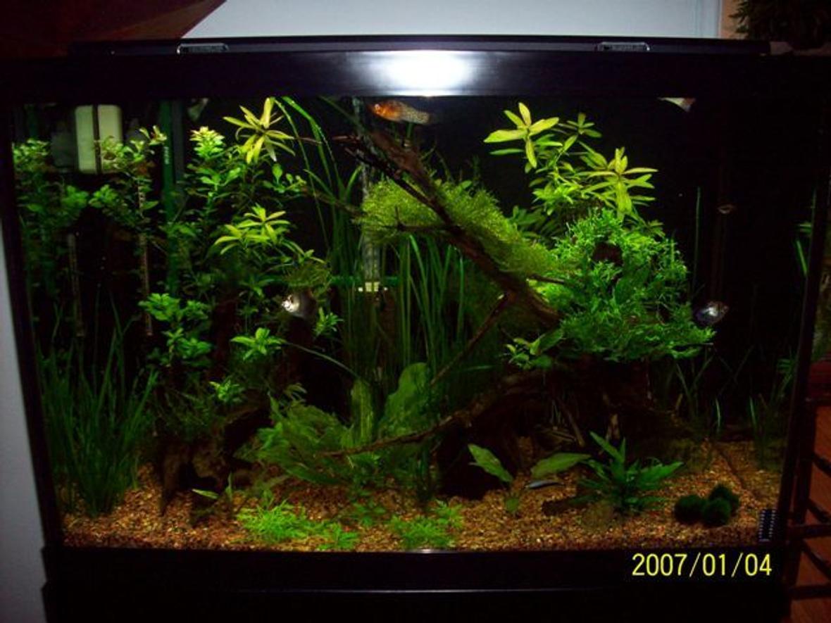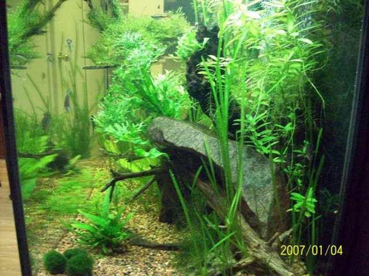65 gallon perfecto tank with glass canopy 2 x 42 watt coralife NO T5's, Eheim 2213 cannister filter, 2 x Hydro sponge filter's with optiuma dual air pump, Top Fin 300 watt heater, flourite with laterite substraight, natural granite rocks alone with natural drift wood.