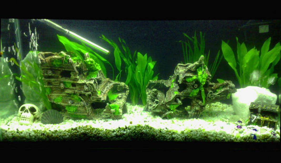 The Black Pearl has sunken into Davie jones's locker! (pirate ship) also has a large skull with a bubble pad buried underneath, and with a splitter i'm also running a treasure chest with open and close bubble effect off of the same air pump, a large white crystal rock and two green crystal rocks with small white crystals sprinkled on top of the gravel, and six real plants.
