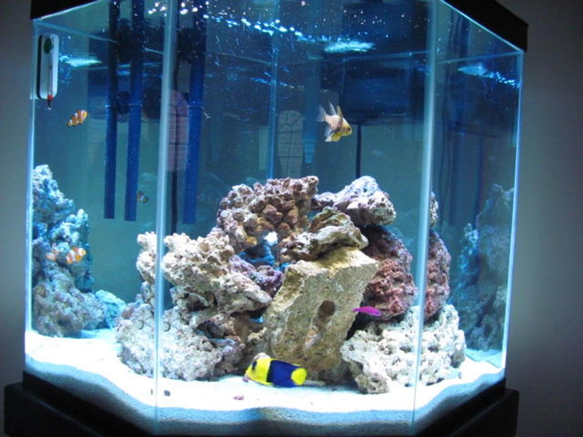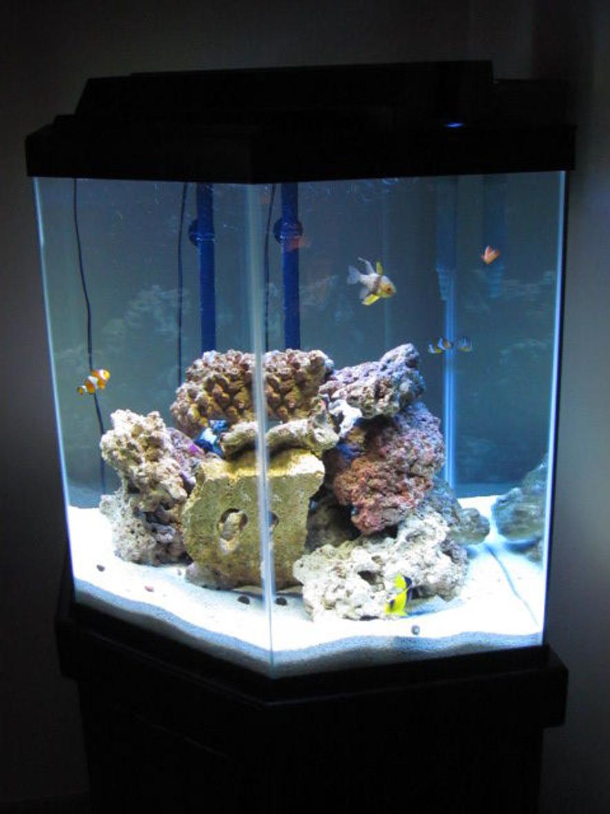 I have a 44 gallon pentagon corner aquarium and I use an Aquaclear 70 as my filter.I use purified water from my Big Berkey filter that I mix with Instant Ocean salt. I have a white light and a blue light that are on timers and go on and off at different times. Sometimes they are on at the same times and sometimes they are on alone. I don't use any special equipment and I do a partial water changes every 6 weeks along with a filter change.