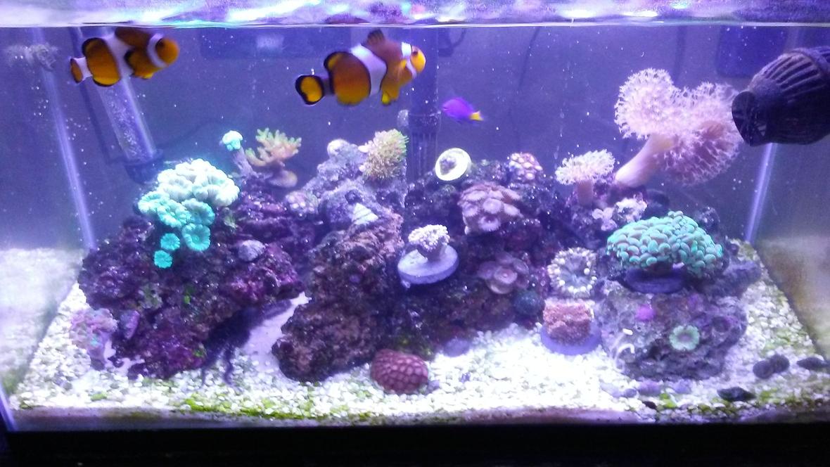 10 gallon nano 12-15 lbs live rock El Cheapo power filter with Sea Chem Sea Gel in filter chamber.Coralife Biocube skimmerKoralia Powerhead Current USA Orbit lights