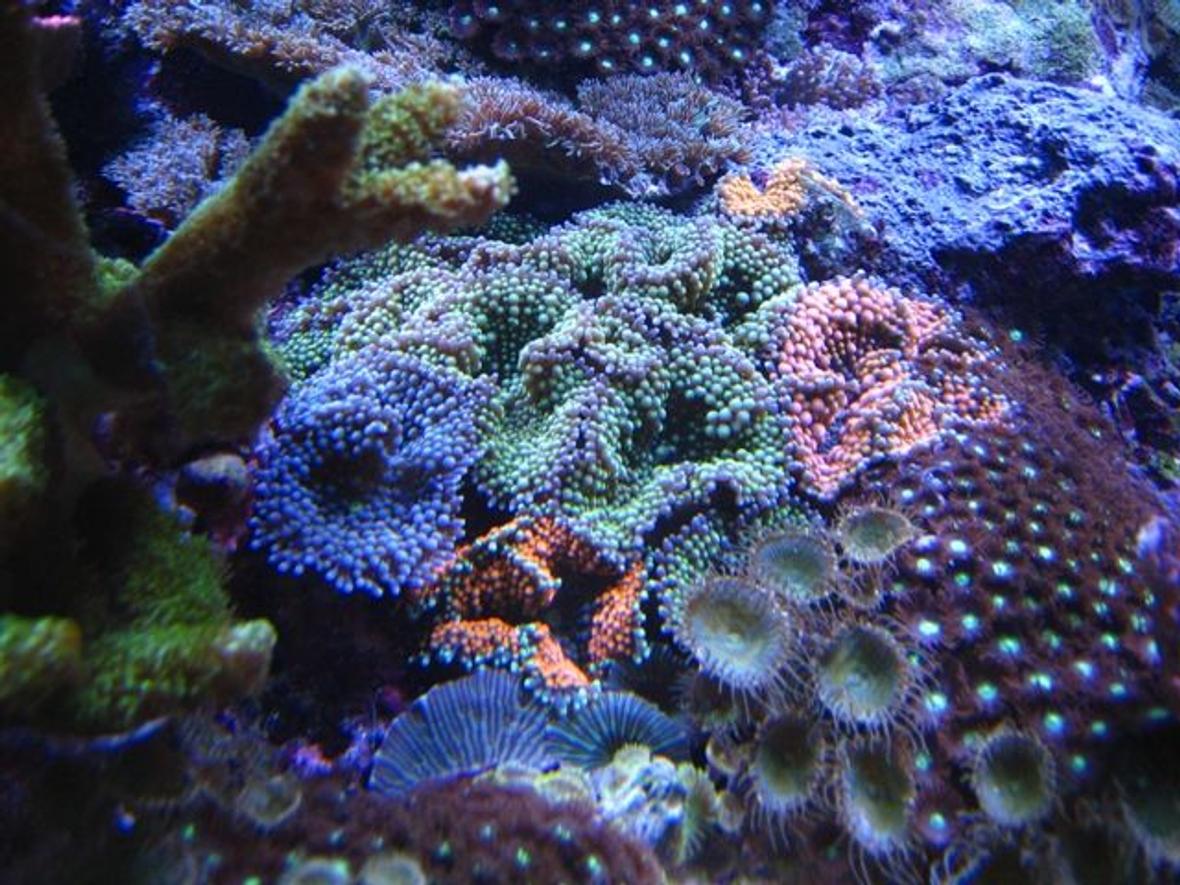 Galaxia, Xenia, Ridged Tongue, Red Mushrooms, Blue Spotted Mushrooms, Frog spawn, Hammer, Chilli, Green Staghorn, Orange Cap Montipora, Purple Cap Montipora, Orange / Bue / Geen/ Rose / Yellow Florida Recordas, Green Brain Coral Head, Green Duncan Wiskers, 2 Clams, Feather Duster, Coco Worm, Orange Sun Coral, Orange Encrusting Montipora, Green and Purple Acan, Green Cup. At least 7 mother coloines of diffrent color Zoos. 5 more frags of new colors of zoos were just added to our collection.