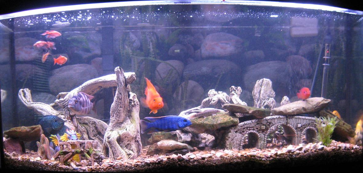 18 fish total, 9 cichlids, 2 corys, 1 pleco, 4 algae eaters, 2 rosy barbs. Also 3 prawn that managed to hide and grow big enough to fend off the fish. Cichlids are a mix, but they all have their own spot and get along. The largest, which is hiding in the back left corner, is a Jack Dempsey measuring about 8" long. The rosy barbs were doomed/moved to this tank while cleaning the small tank. They're not much bigger than some of the feeder fish we buy.