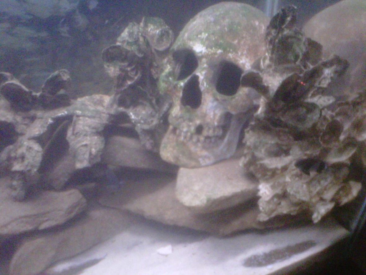 My 55 gallon mostly local tank. With local rocks, sand, shells, store bought bleached oyster clusters, skull and plant. 1 canister filter with power head, 2 hanging filters to keep surface water moving, and 1 protein skimmer