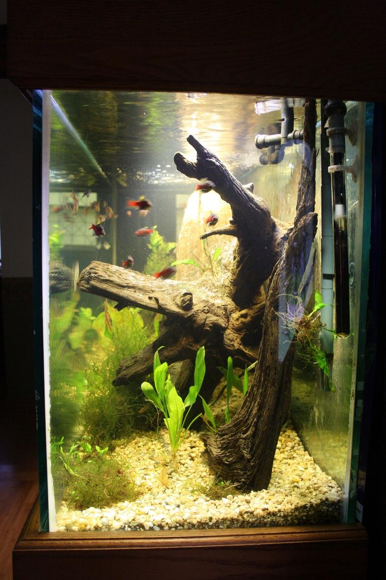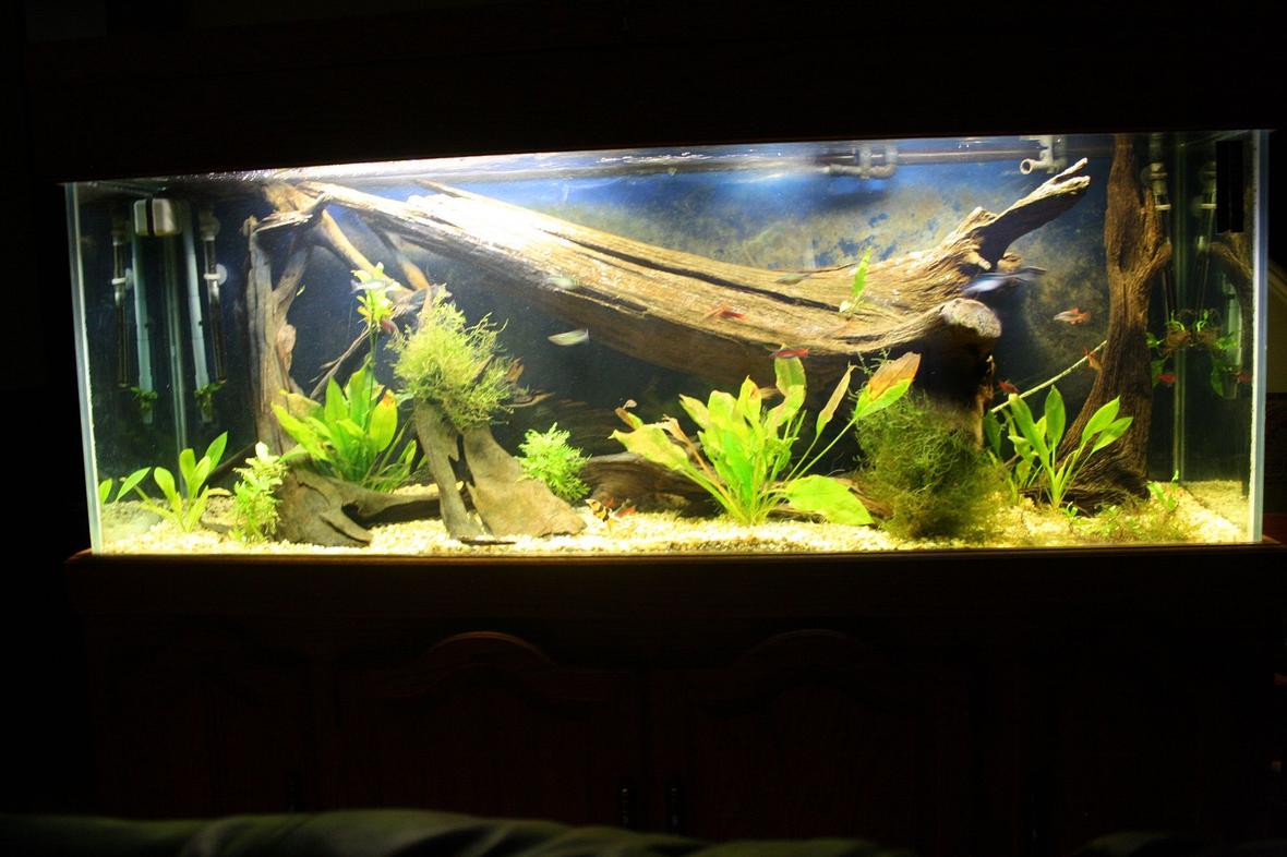 Freshwater tank with large locally collected driftwood pieces. The largest log would not fit in a 125, weighs about 50 lbs. and took two people to place in the tank safely. 150 gallon glass tank in oak cabinet and canopy. Rena and Cascade canister filters with mechanical, chemical and biological media. JBJ Aqualighting HO florescent fixtures.