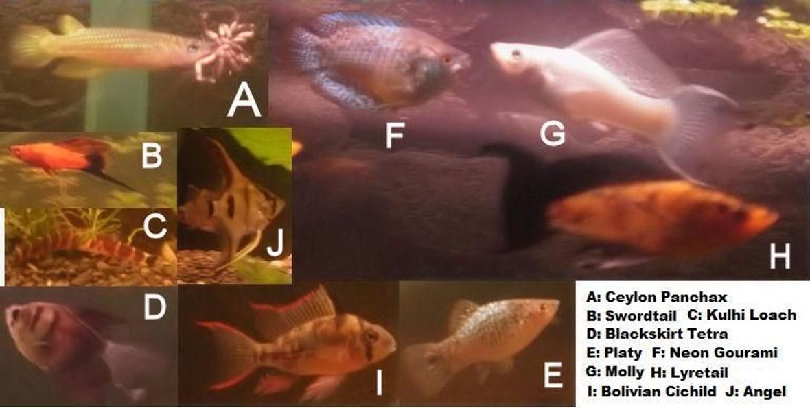 Neons, Guppies, Swordtails, Angel Fish, Mollies, Kuhli Loaches, Silver (Bala) Sharks, Bristlenose Catfish, Clown Loach, Platy, Bolivian Ram Cichild... about 37 all up just to start out with...