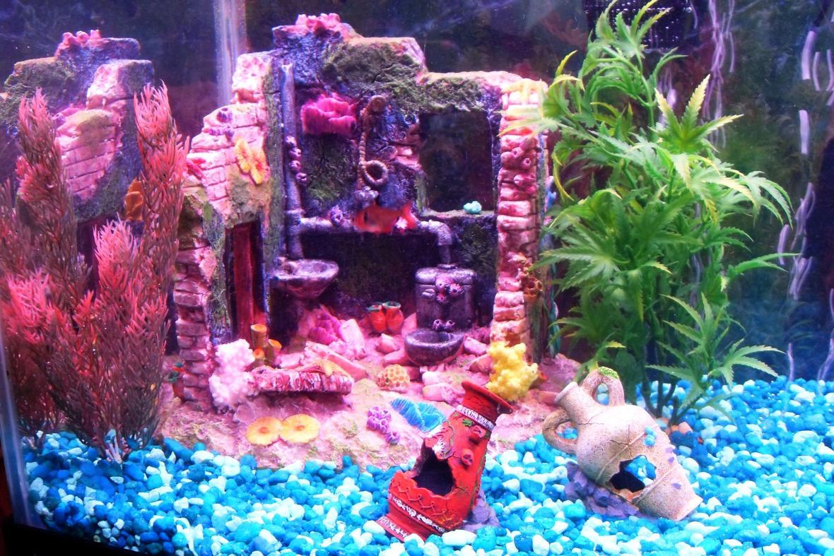 Description: 55 gal. Tank, everything was bought from walmart & local pet store. A sunken bathroom is on the left and a refrigerator on the right. Some plants are real some aren't.