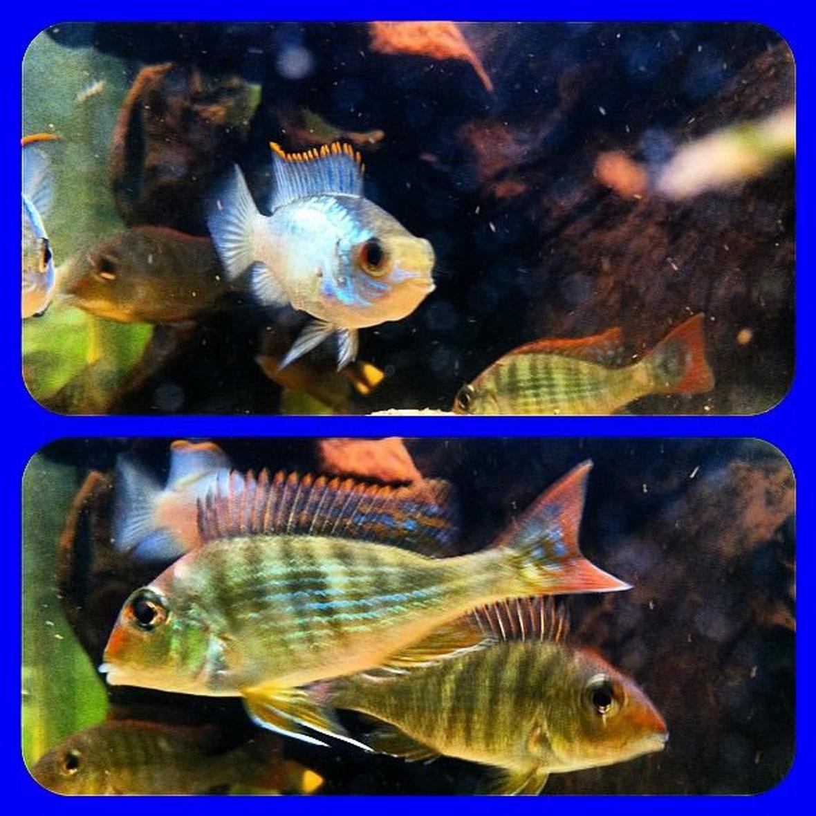 Tapajos Orange Head, 2 Electric Blue Acara, and 2 dwarf bristle nose plecos.