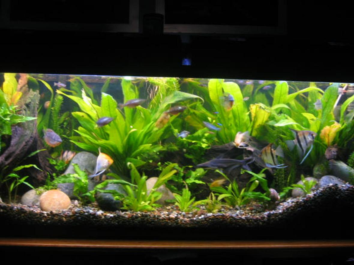 55 gallon tank with peguin 330, undergravel filter, turbo co2, heater,diamondback flourlestant 80watts. ALL LIVE AND REAL amazon swords, java fern, and some other plants. i have neons, tetras, gourmies, angels, tiger barbs, rainbows, zebras, peacock eel, dwarf rams, clown loaches, fiddler crabs, and mystery snails.