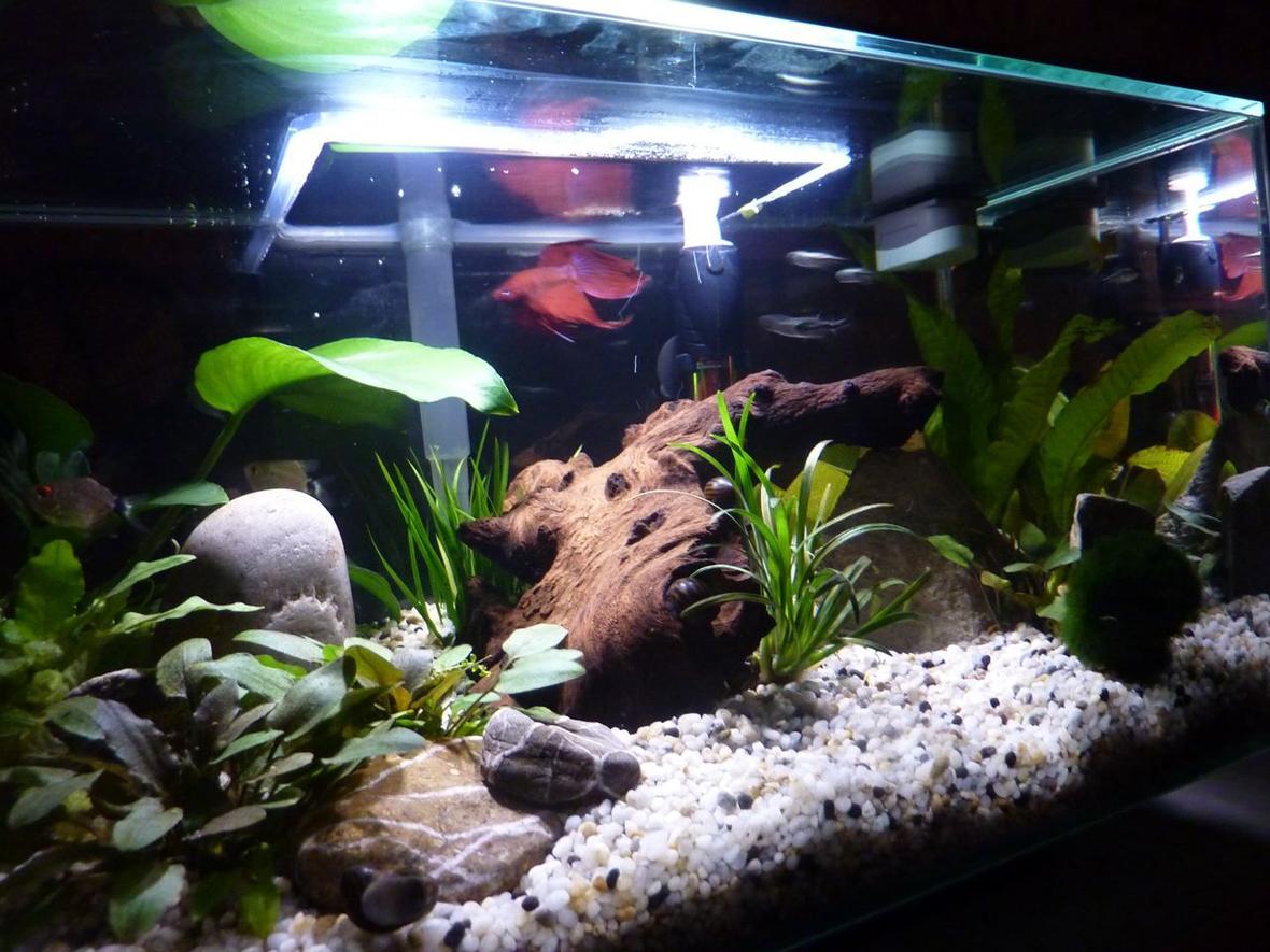 1 Betta, 4 Black Neon Tetra, 2 Red Eye Tetra, 1 Small Pleco, 3 Zebra snails