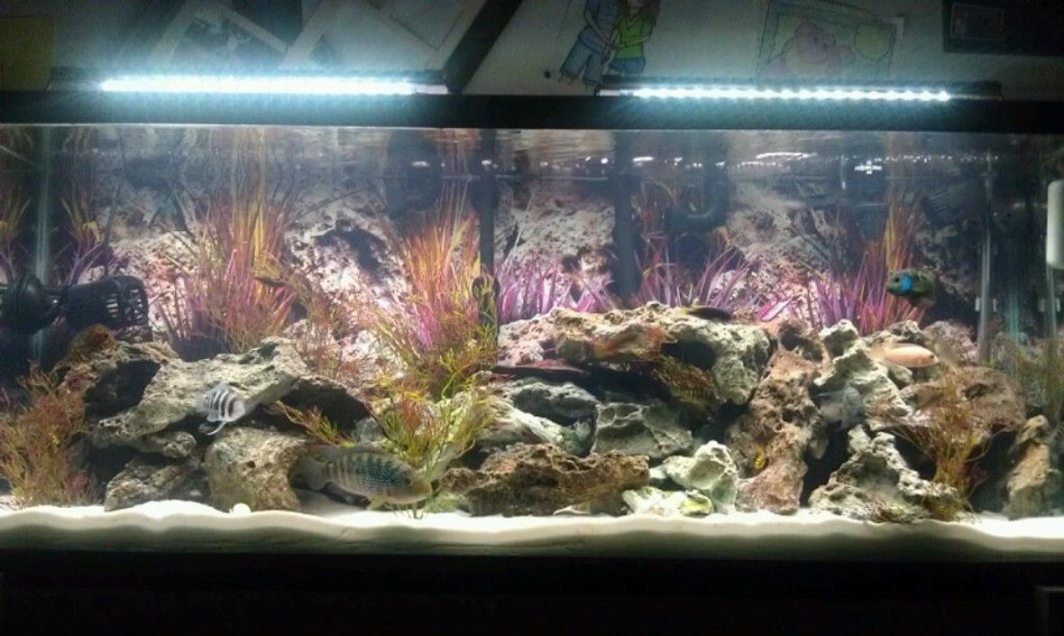 1 Frontosa ciclid, 1 Black ghost knife, 1 African Leaf fish, 1 Dinosaur Bichir, 1 Ram ciclid, 3 kinds of Peacock ciclids, 3 electric blue ciclids, 4 electric yellow ciclids, 1 Afra ciclid, 2 Acei, 1 Angelica Boita, 2 Jack Dempsy, 2 African Featherfin catfish, 2 Black convicts (male and female), 1 rubber lip pleco, 1 Chinese algae eater, 2 Auratus ciclid (blue and yellow), 1 orange ciclid, 1Geophegus, peacock eel and moliro ciclid