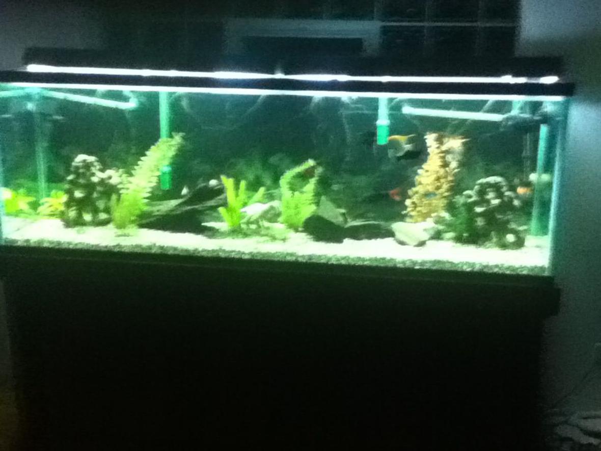 9 angels,6tetras,2 red tail sharks,1black molly,1oragne pattye,2spiiney plecos,and 4 blue crayfish