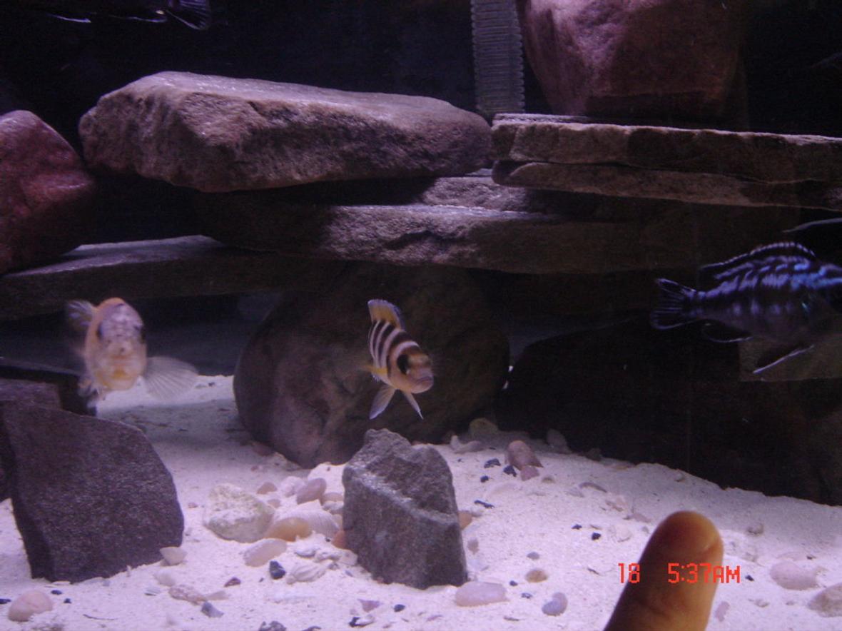 None. All rock work from our local rock store. 200 pounds of it. Also, substrate is Argonite sand.
