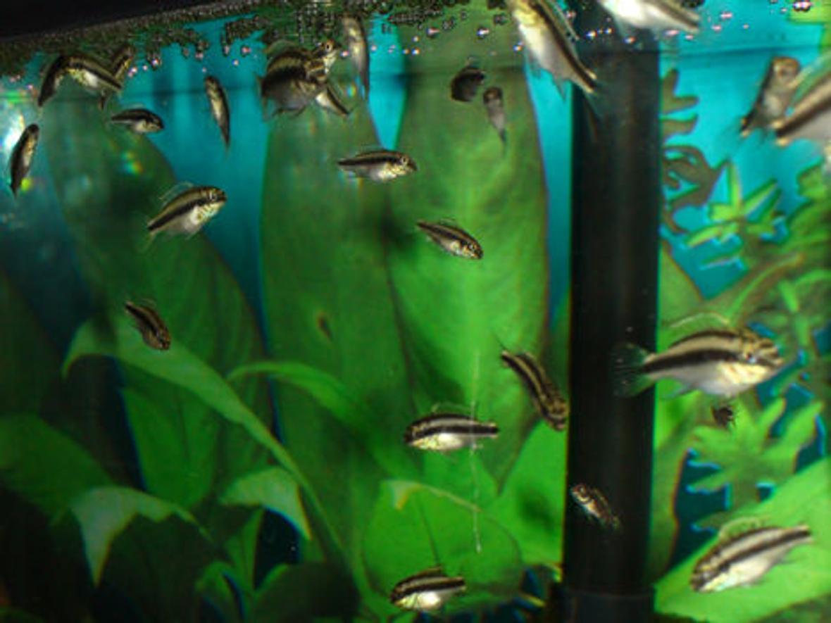 In my 15 tall at work, I have 8 neon tetras, one angel, 2 cories, 2 dwarf pleco. In my 55 I have my surviving male krib, 1 angel, 3 cories, 3 otos, 9 black neons, 3 rasboras, 7 bloodfin tetras, 3 bosemani rainbows, 3 hatchets. I have no fish in my 90 yet as it is a project which I was turned on to looking at your site one day and the African cichlid tanks were #1, and #4. Cool fish! I have just finished my BG and installed 90% in my 90 so we are getting closer. I also have an 18 tall with about 30 baby kribs in it.