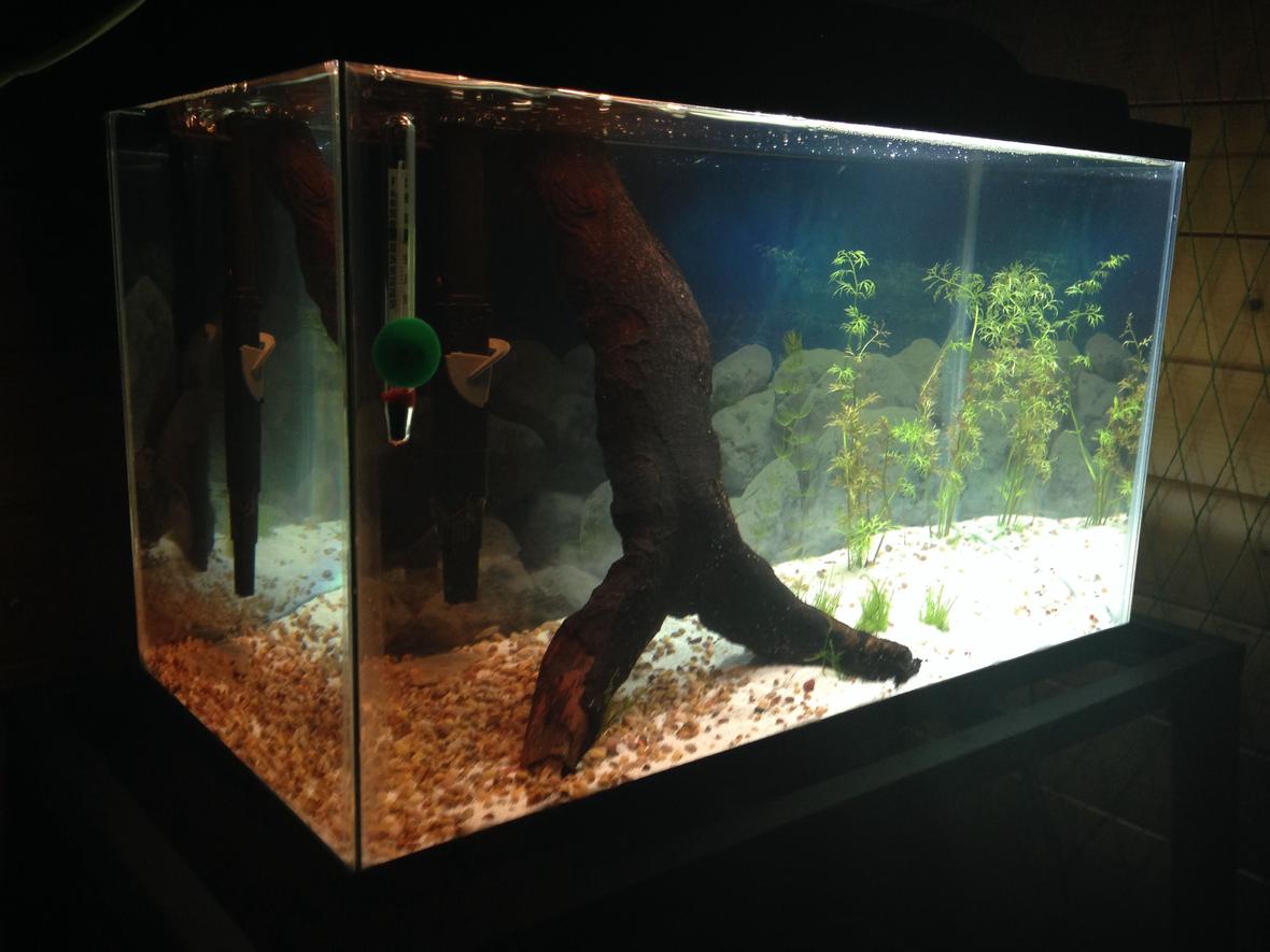I use ocean sun 10,000K lighting and a Marineland Penguin Power Filter 400. For my heater I use eheim jager 150W. Then I have two homemade yeast reactors. I used black poster board paper for the background. My light tan rocks are petrified trees I found. I am trying to go for a South America look and natural look.