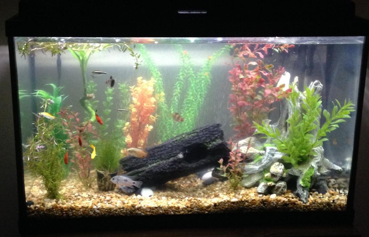 29 gal freshwater tank. Keep it about 78 degrees. I have 4 live plants( one floating) and a bubble wall.