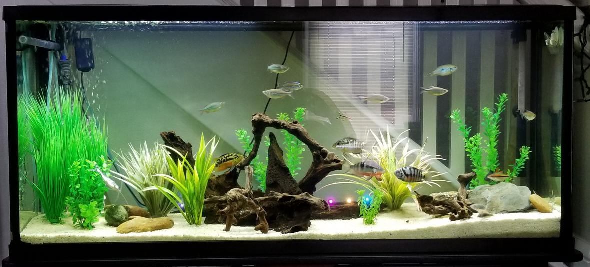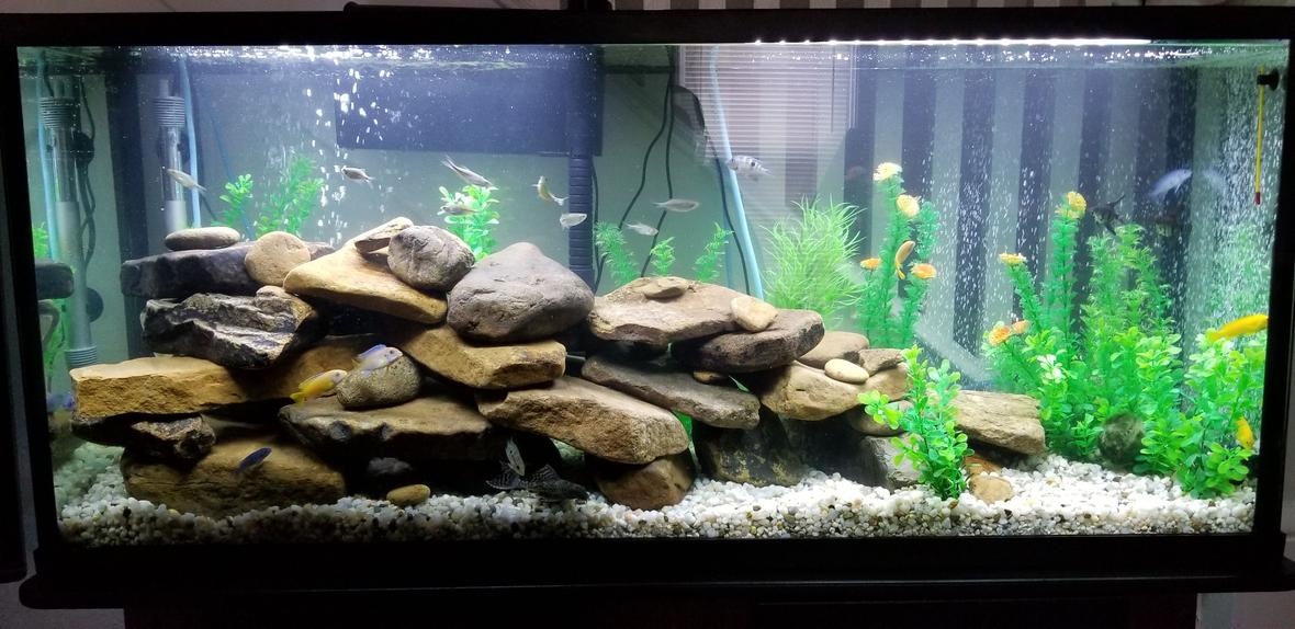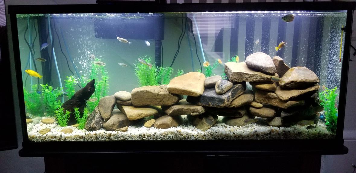 55 gallon South American tank. Standard LED lighted hood. Artificial vegetation, locally found rock. This is just the beginning.