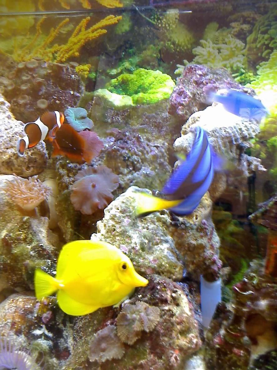 1Blue Tang, 1Yellow Tang, 1Lawnmower blenny, 5 blennies, 1 Pajama cardinal, 1 chromis, 3 different damsels, 1 blood shrimp, 1 peppermint shrimp, 3 tiny long white eels.