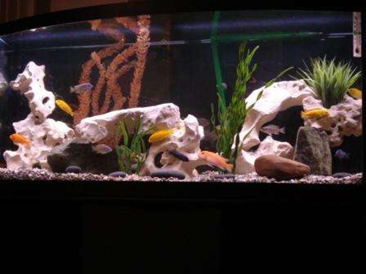 African Cichlid 75 Gallon bow front tank. 48"L x 18.5"W x 21"H. Eheim 2215 filter. This filter is awesome, keeps the tank spotless for weeks, highly reccomended.