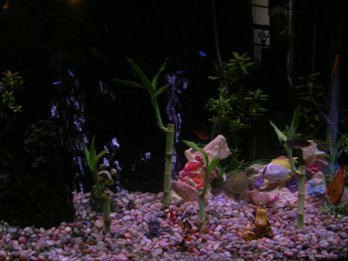 two discus, an angel, 2 sepea tetra, 6 neon tetras, two rainbows, a pleco, 2 algea eaters, 2 gouramis, and 2 danison barbs.