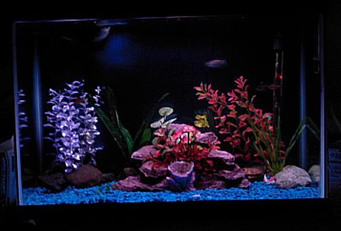Some plants, 4 Angelfish, 6 redeye tetras, 5 zebra danios, 1 three spot gourami, 1 CAE