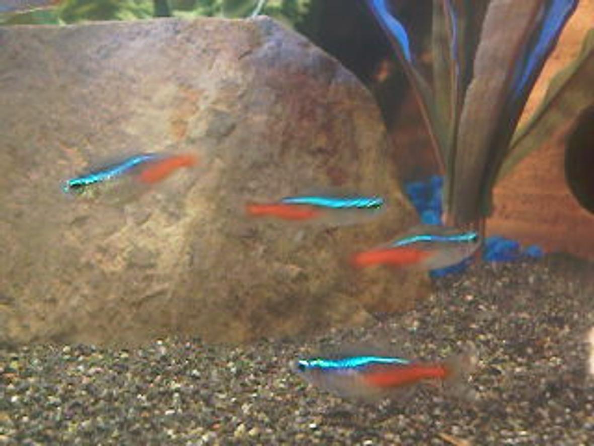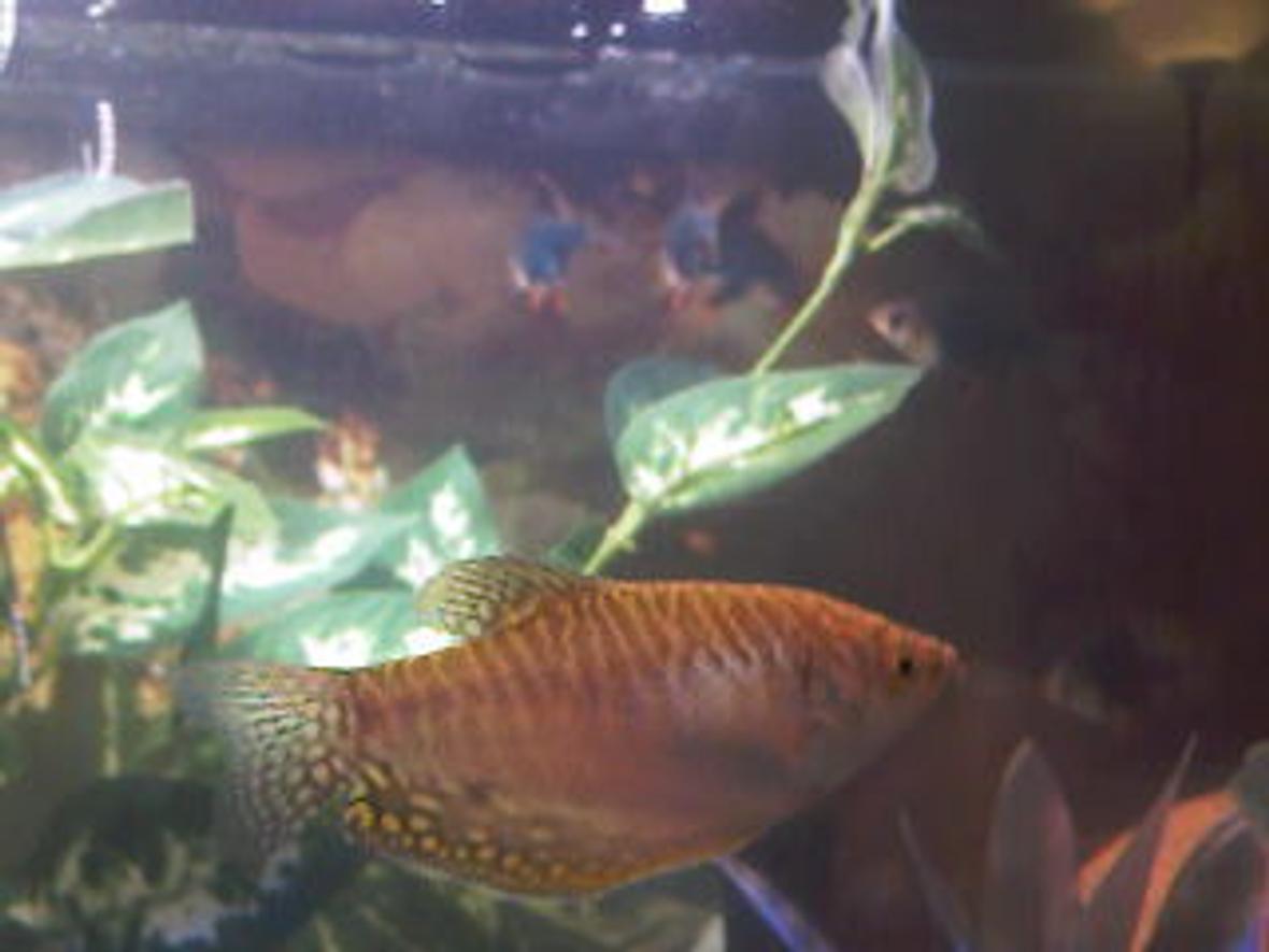 1x Dwarf Gourami, 1x Opaline Gourami , 1x Golden Gourami, 5x neon tetra, 5x red tetra, 1x algae eater, 6x green tiger barbs, 2x american flag fish.
