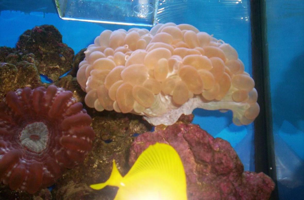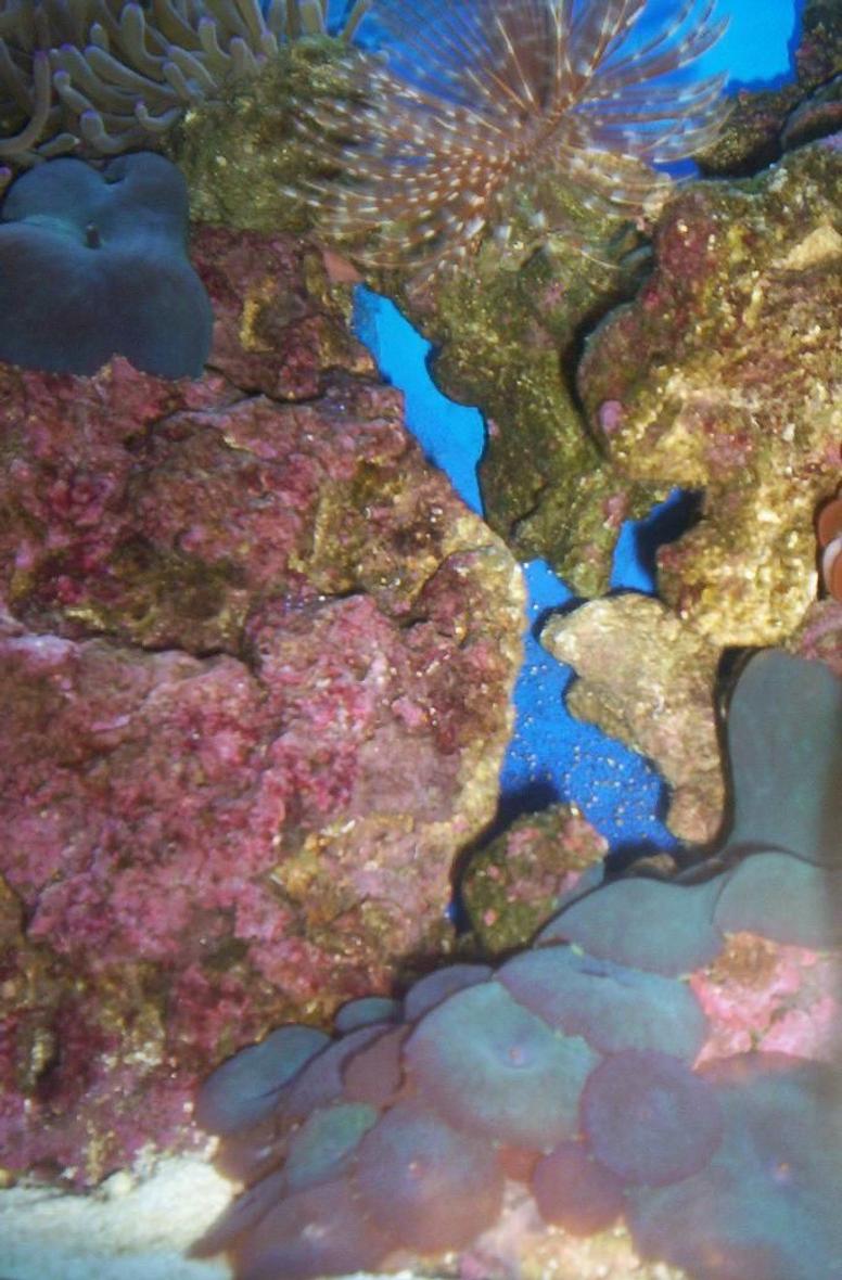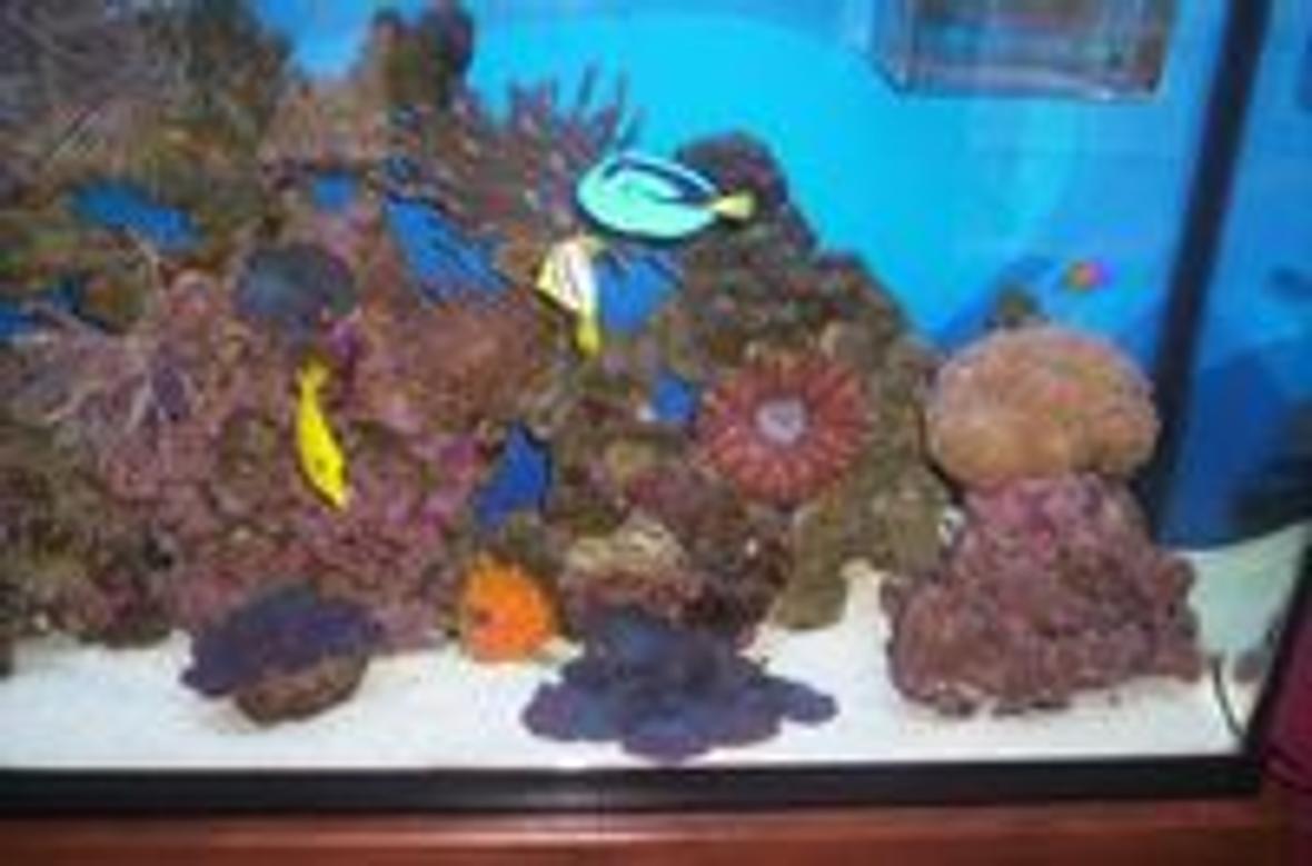 90 lbs of live rock,live sand a few Marroon mushrooms, red cinarina coral,1 purple tip anemone,1purple oyster,1 bubble coral, 1 foxes coral, green neon pogoda coral ,3 feather dusters ,1 cauliflower colt coral,1 orange polyp...