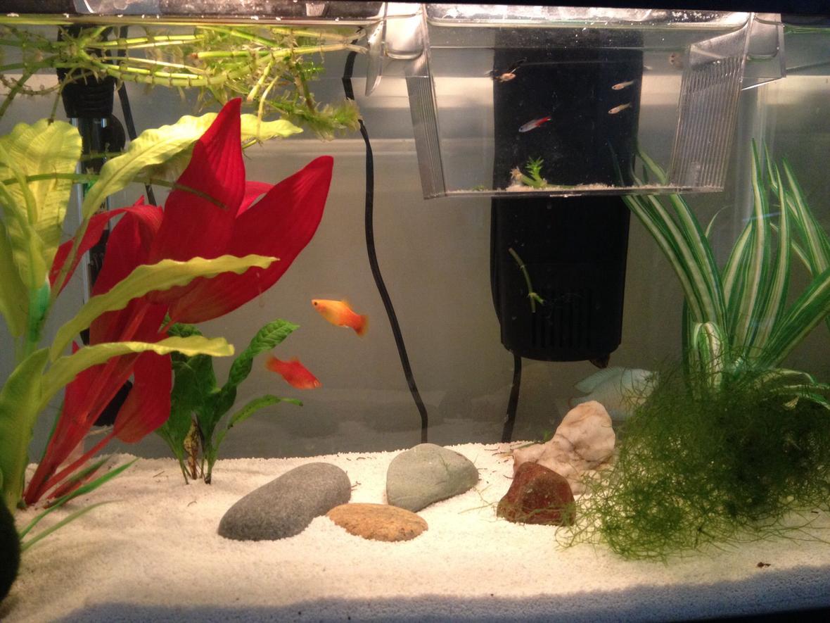 Rectangular with many tropical fish, java fern, java moss, anachris, a fry breeder and cleaner crew.