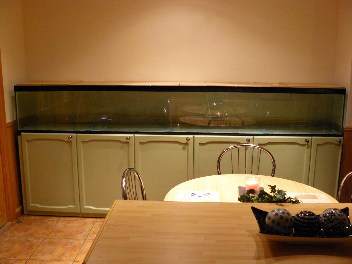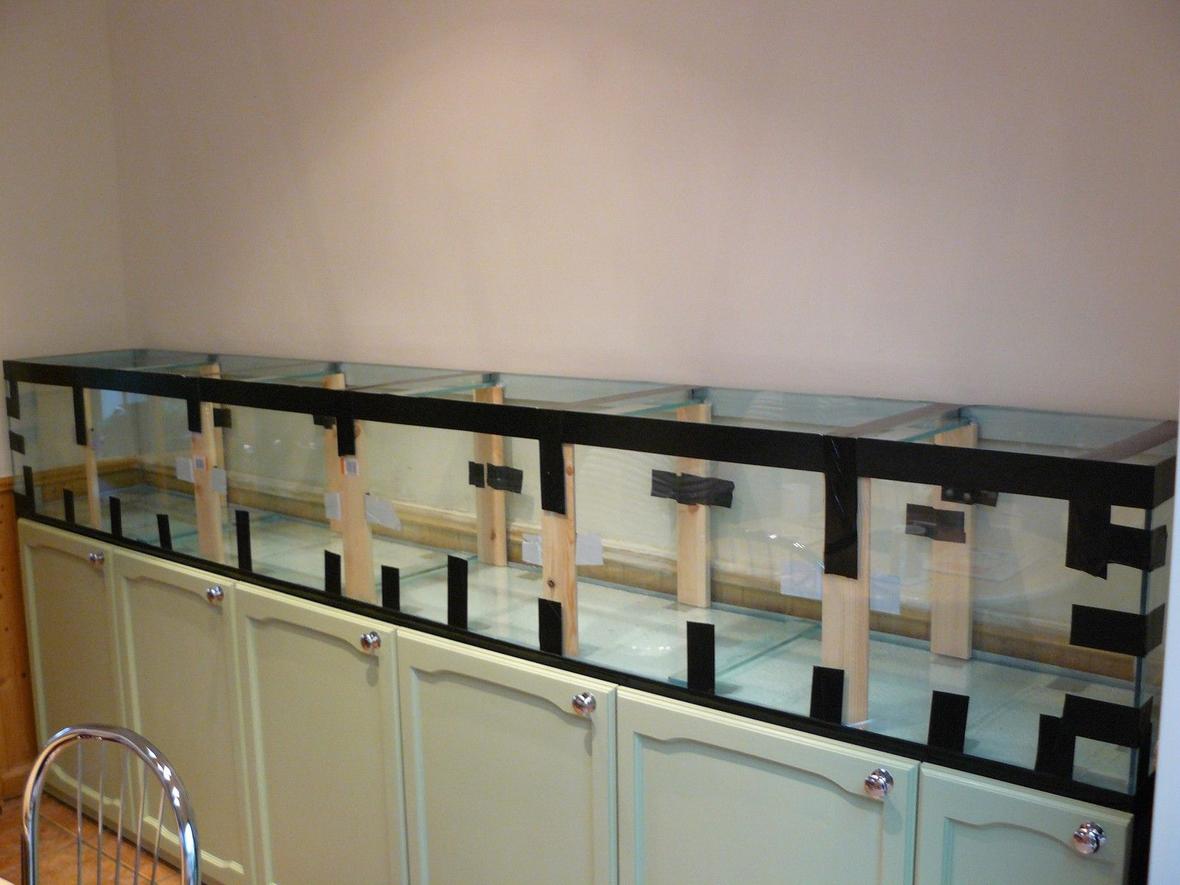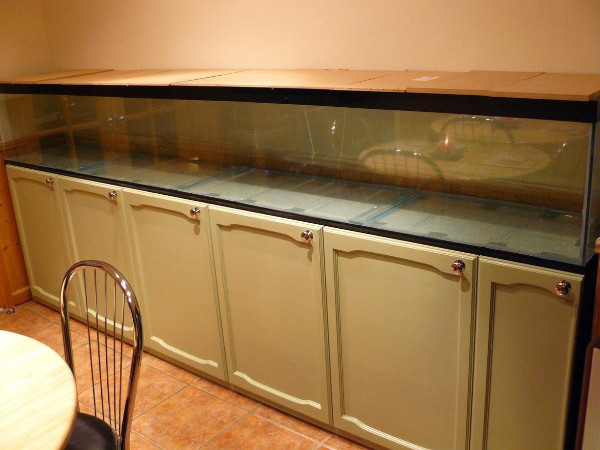 The main tank is 10ft long x 16" high x 15" depth. The stand is made of 2" X 2" steel box section and will hold the weight of over 2 tonnes,On top of that is a timber flat base and polystyrene. All the doors are pine and painted. The hood is pine and primed and painted. The glass is 8mm thick but the bottom has an extra section (which is 16mm smaller than the base) thus forming and corner to bond the sides to. Used six tubes of top quality silicone. But was still petrified when I GRADUALLY filled it. (No leaks. phew!!)There are 4 x 42" t5 lights and the condensation tray is made from poly carbon and cut into 6 sections with handles fitted for ease of access to any section of the tank.