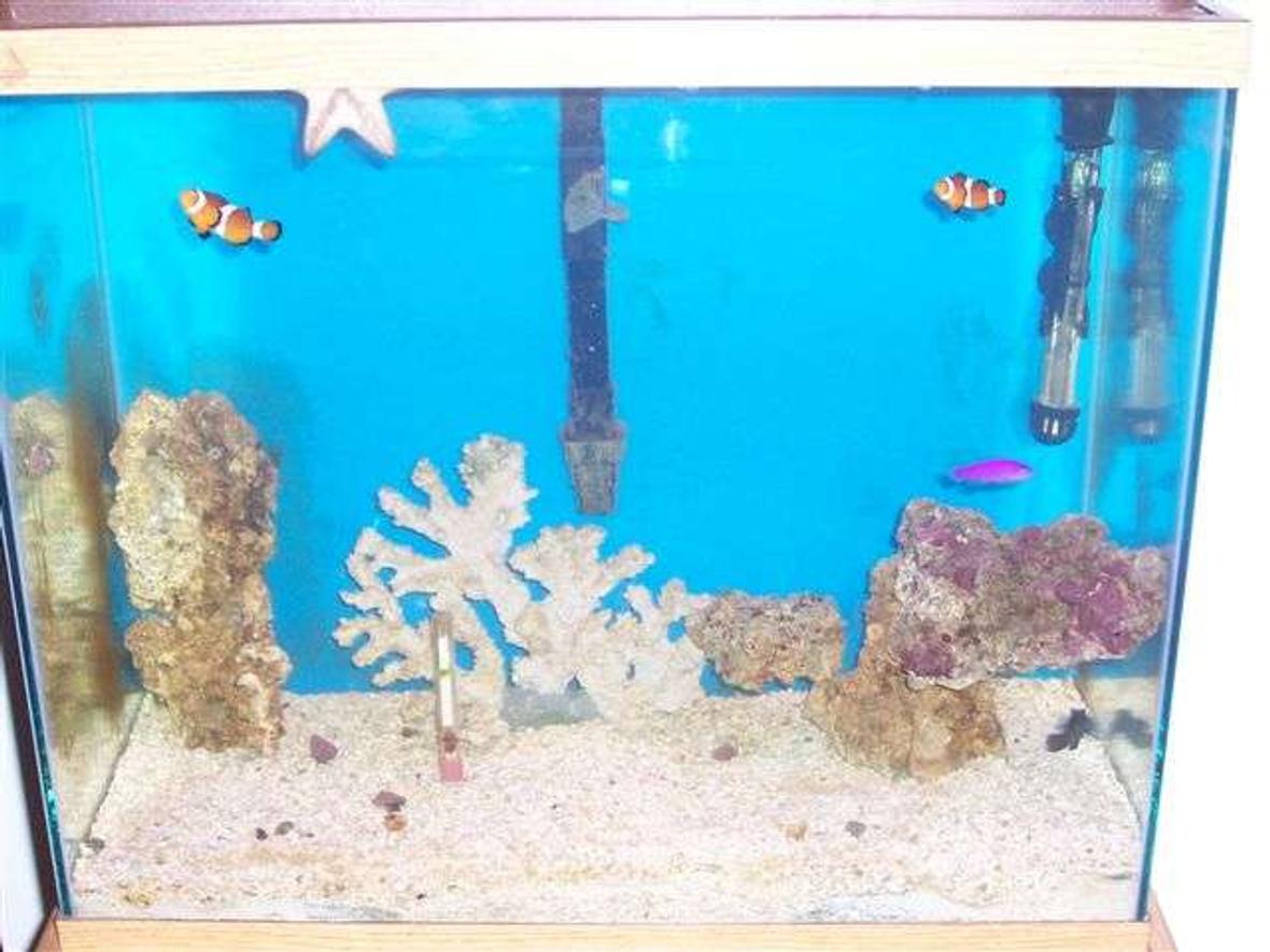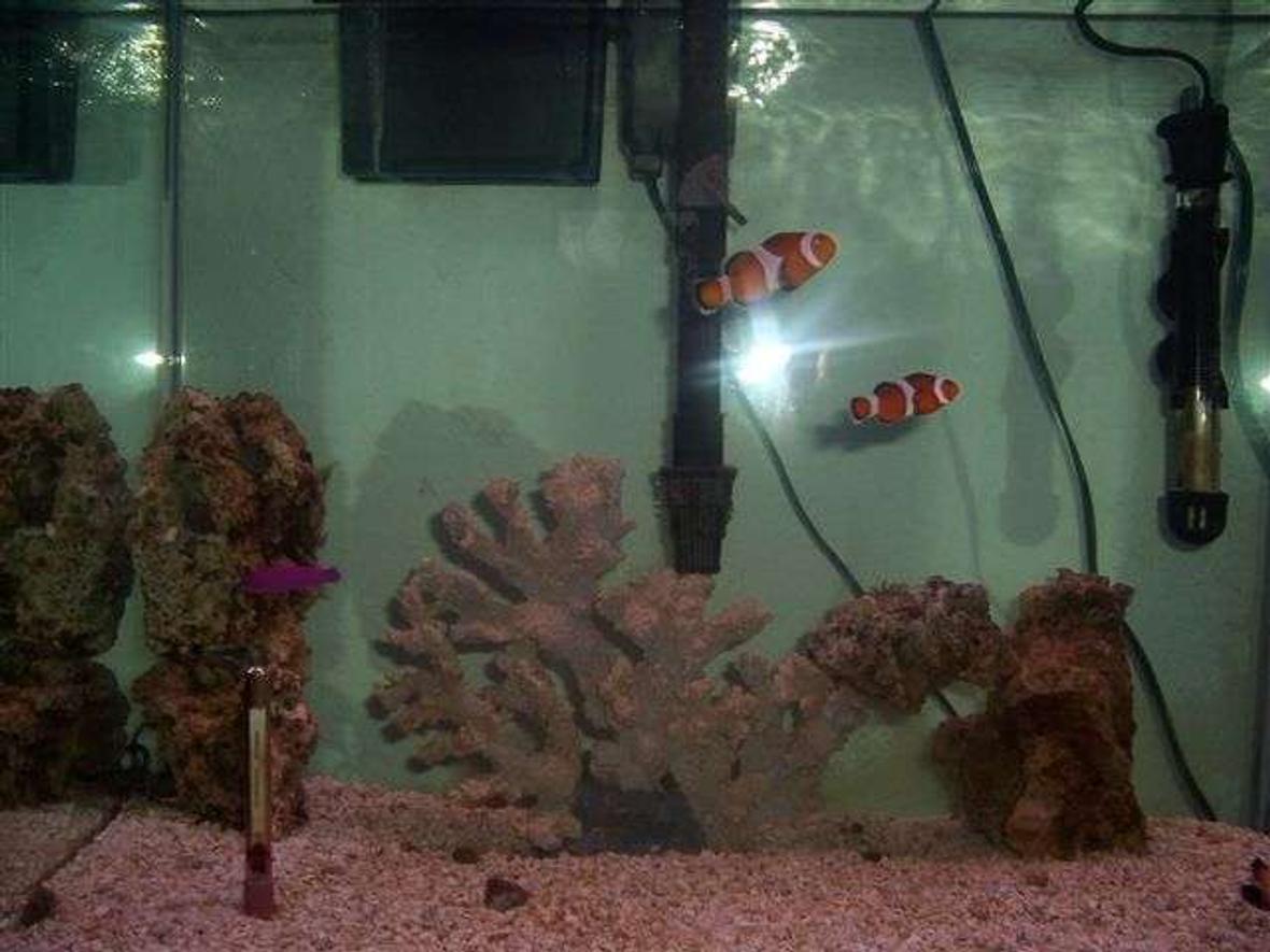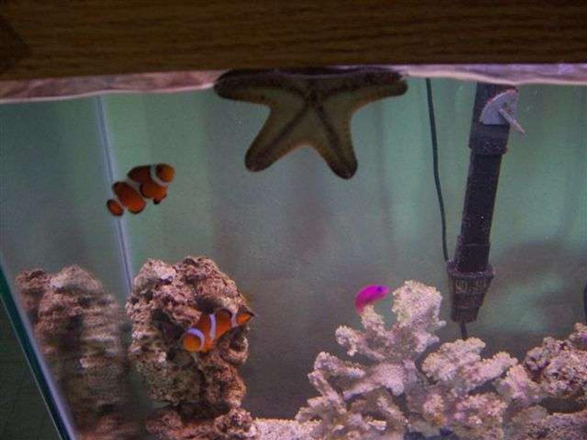 2clownfish,1Yellow Tang,1Lawnmower&1Scooter Blenny,Sea serpent,Blue starfish,Purple tip anemone,