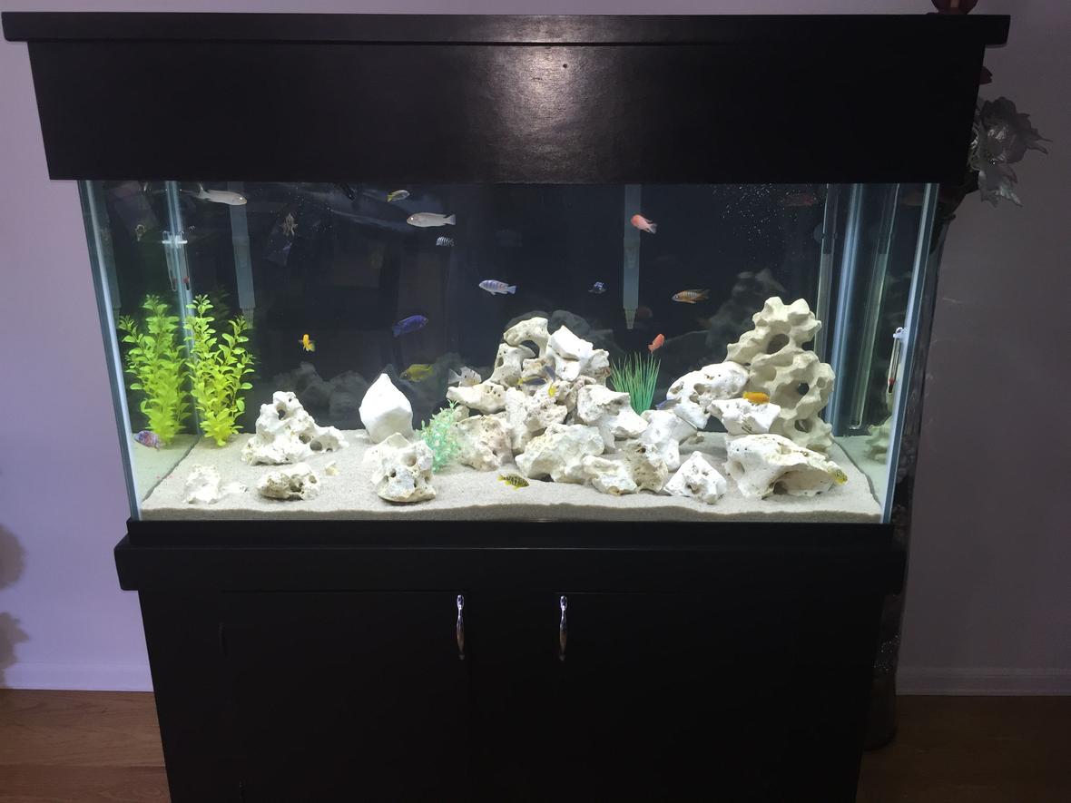 90 gallon aqueon freshwater african cichlid tank with a few unusual companions. 2 aquaclear 110. 300w jager heater. current usa satellite plus led light. filter sand substrate and texas holey rock.
